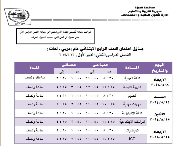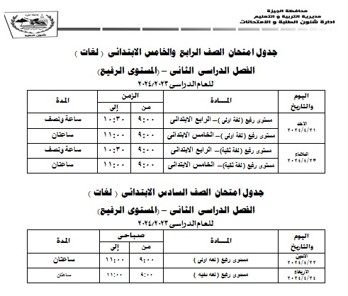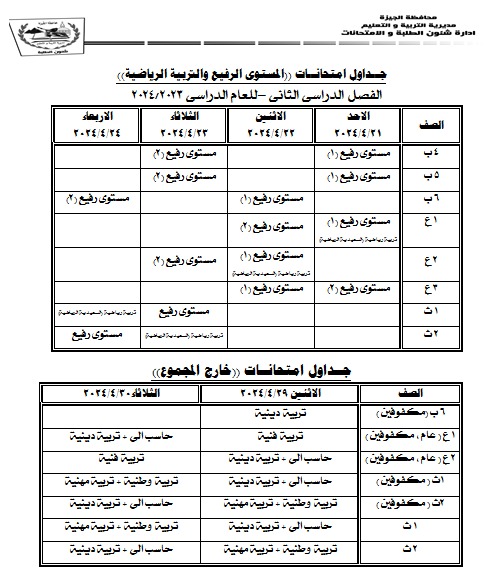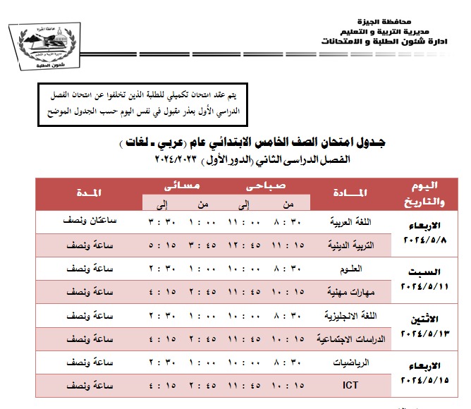 جداول امتحانات الفصل الدراسي الثاني للمرحلة الابتدائية بالجيزة