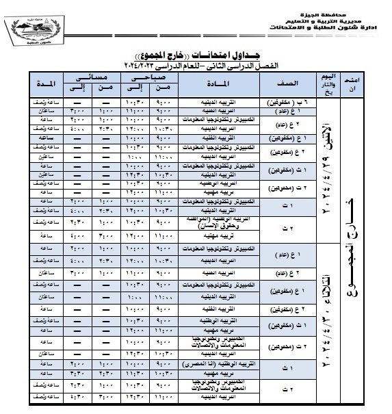 -امتحانات مواد خارج المجموع تبدأ يوم الإثنين 29 أبريل حتى الثلاثاء 30 أبريل 2024.