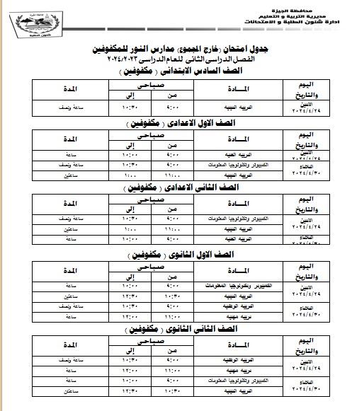 - الصف السادس الابتدائي (عام وفصل واحد ومكفوفين) والثامن ( صم وضعاف السمع) يبدأ من الخميس 9 مايو وحتى الخميس 16 مايو ٢٠٢٤.