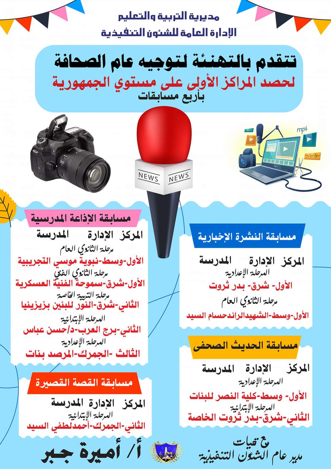 أعلنت مديرية التربية والتعليم بالإسكندرية برئاسة الدكتور عربي أبو زيد، عن فوز مدارس الإسكندرية في 4 مسابقات على مستوى الجمهورية بالمراكز الأول والثاني والثالث في مسابقات النشرة الإخبارية والحديث الصحفي والإذاعة المدرسية والقصة القصيرة، وذلك بالمسابقات التي شارك فيها توجيه الصحافة المدرسية بالمديرية برئاسة ماجدة عبد الستار وإدارة شرق التعليمية برئاسة جلال عيد وتحت إشراف أميرة جبر المدير التنفيذي للمديرية ونادية فتحي وكيل مديرية التربية والتعليم.