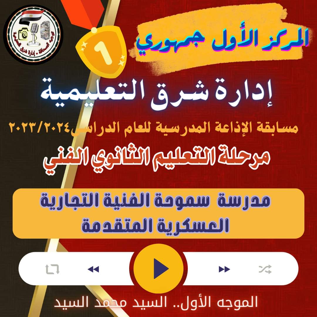 وفازت مدرسة سموحة الفنية التجارية العسكرية بالمركز الأول جمهوري للمرحلة الثانوية، في مسابقة الإذاعة المدرسية للعام الدراسى ٢٠٢٣ /٢٠٢٤