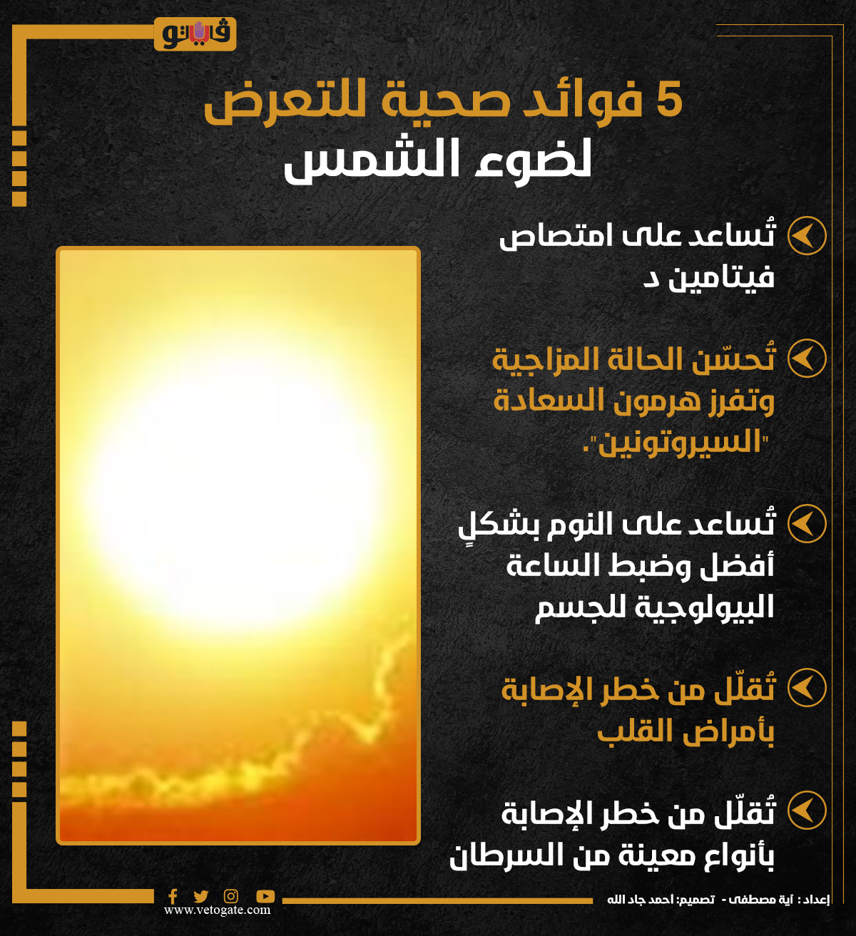 5 فوائد صحية للتعرض لضوء الشمس (إنفوجراف) الخميس 25/أبريل/2024 - 02:23 م 4/25/2024 2:23:46 PM الشمس، فيتو آية مصطفى شارك طباعة 18 حجم الخط شارك طباعة الساعة البيولوجية الإصابة بأمراض القلب الحالة المزاجية ضوء الشمس هرمون السعادة انفوجراف السيروتونين