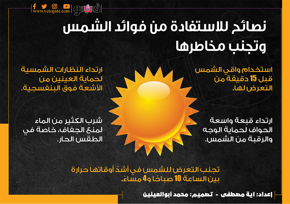 نصائح للاستفادة من فوائد الشمس وتجنب مخاطرها (انفوجراف) الجمعة 19/أبريل/2024 - 04:32 م 4/19/2024 4:32:10 PM ضربة الشمس، فيتو آية مصطفى شارك طباعة 18 حجم الخط شارك طباعة الخلايا السرطانية الجهاز المناعي البقع الداكنة أمراض القلب النظارات الشمسية ضوء الشمس منع الجفاف مستويات الكوليسترول