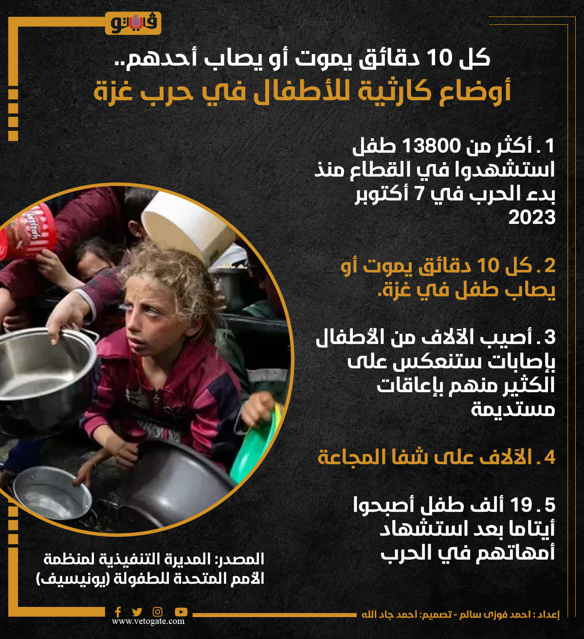 كل 10 دقائق يموت أو يصاب أحدهم.. أوضاع كارثية للأطفال في حرب غزة (إنفوجراف) الخميس 18/أبريل/2024 - 11:58 م 4/18/2024 11:58:31 PM أطفال غزة، فيتو احمد فوزى سالم شارك طباعة 18 حجم الخط شارك طباعة أطفال غزة غزة يونيسيف حرب غزة ضحايا حرب غزة