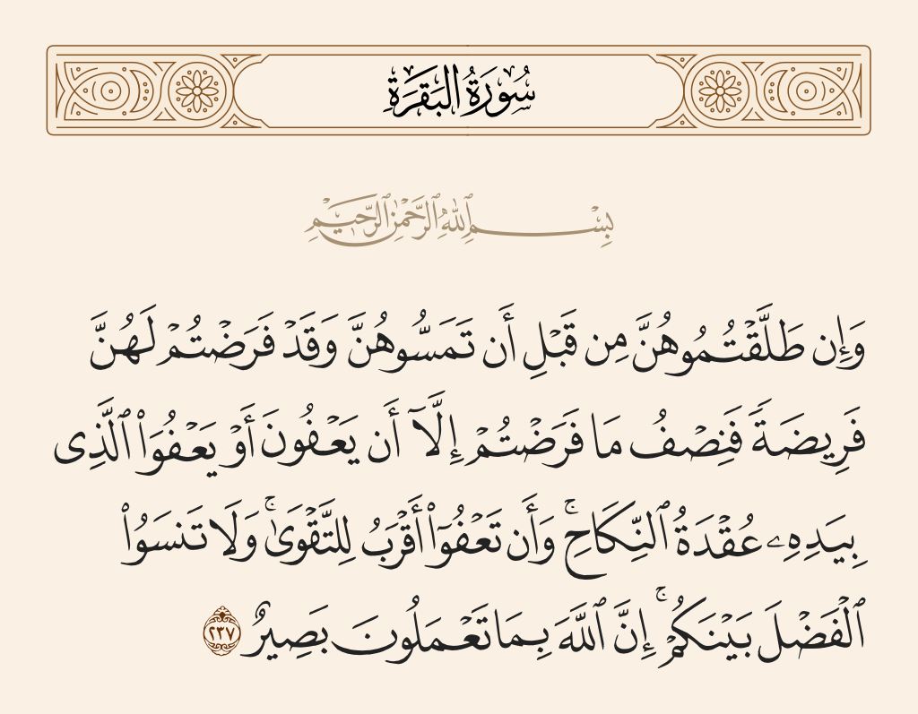 قال تعالى: «وَإِنْ طَلَّقْتُمُوهُنَّ مِنْ قَبْلِ أَنْ تَمَسُّوهُنَّ وَقَدْ فَرَضْتُمْ لَهُنَّ فَرِيضَةً فَنِصْفُ مَا فَرَضْتُمْ إِلَّا أَنْ يَعْفُونَ أَوْ يَعْفُوَ الَّذِي بِيَدِهِ عُقْدَةُ النِّكَاحِ وَأَنْ تَعْفُوا أَقْرَبُ لِلتَّقْوَى وَلَا تَنْسَوُا الْفَضْلَ بَيْنَكُمْ إِنَّ اللَّهَ بِمَا تَعْمَلُونَ بَصِيرٌ».