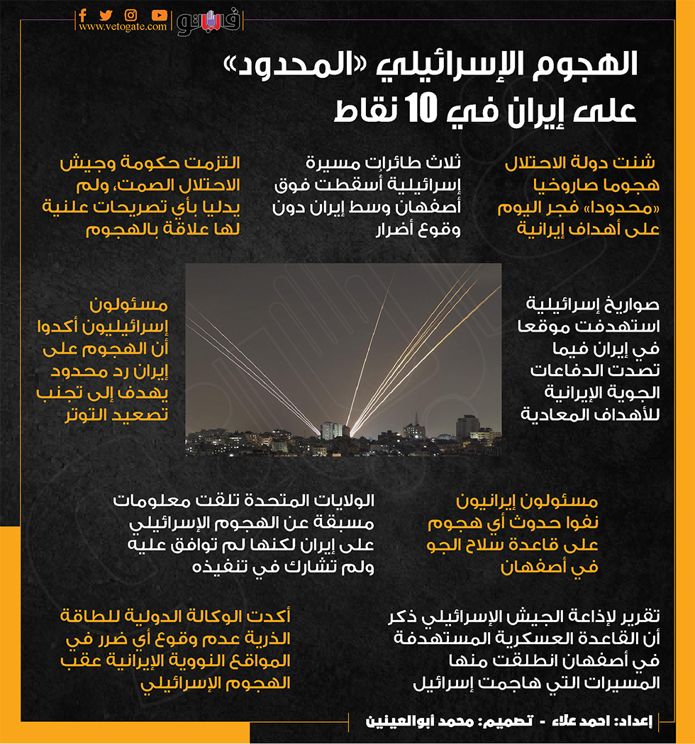 الهجوم الإسرائيلي "المحدود" على إيران في 10 نقاط (إنفوجراف) الجمعة 19/أبريل/2024 - 05:10 م 4/19/2024 5:10:27 PM خامنئي ونتنياهو، فيتو احمد علاء شارك طباعة 18 حجم الخط شارك طباعة الهجوم الإسرائيلي المحدود على إيران الهجوم الإسرائيلي على إيران إيران إسرائيل المنشآت النووية الإيرانية أصفهان