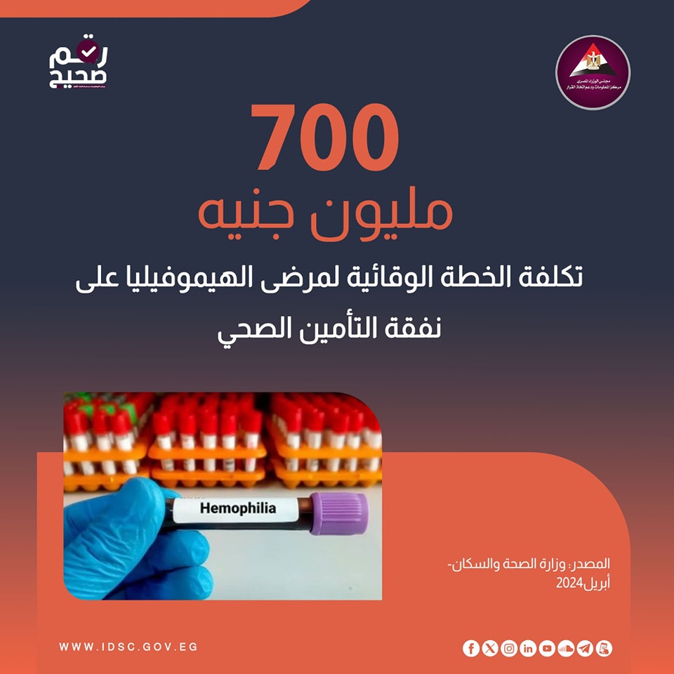 كشفت الصفحة الرسمية لمركز المعلومات ودعم اتخاذ القرار بمجلس الوزراء على موقع التواصل الاجتماعي "فيسبوك" عن تكلفة الخطة الوقائية لمرض الهيموفيليا.
