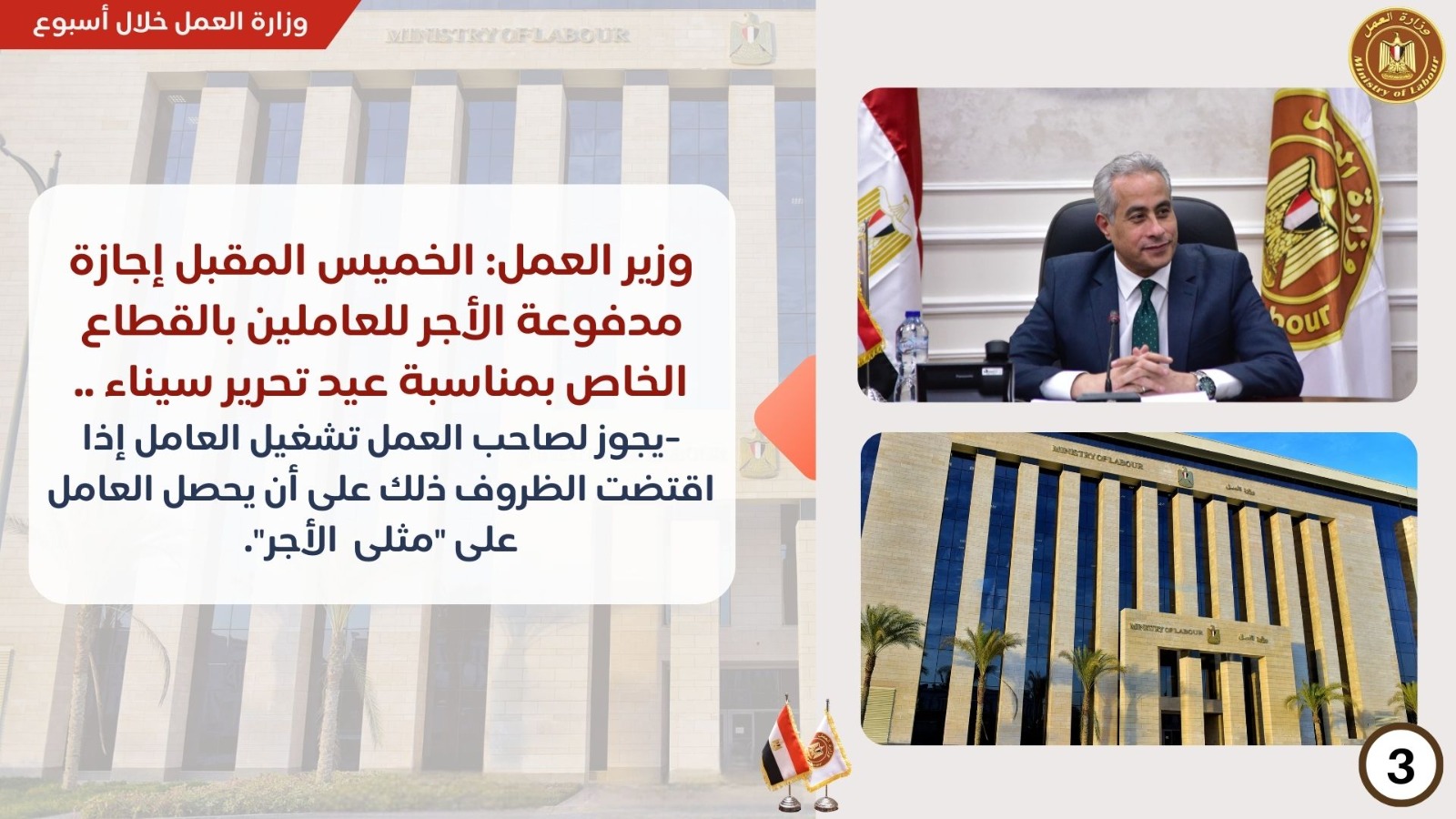 مع ختام الأسبوع أعلن وزير العمل حسن شحاتة، أن الخميس المقبل الموافق 25 أبريل 2024، إجازة رسمية مدفوعة الأجر بمناسبة عيد تحرير سيناء، وذلك للعاملين بالقطاع الخاص المخاطبين بأحكام قانون العمل رقم 12 لسنة 2003، وذلك في ضوء نص قرار رئيس مجلس الوزراء رقم 49 لسنة 2024 والمتضمن: "أن يكون يوم الخميس الموافق 25 من شهر أبريل 2024 إجازة رسمية مدفوعة الأجر للعاملين في الوزارات والمصالح الحكومية والهيئات العامة ووحدات الإدارة المحلية وشركات القطاع العام وشركات قطاع الأعمال العام، والقطاع الخاص، وذلك بمناسبة عيد تحرير سيناء".