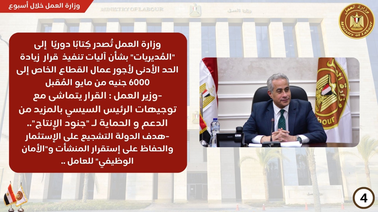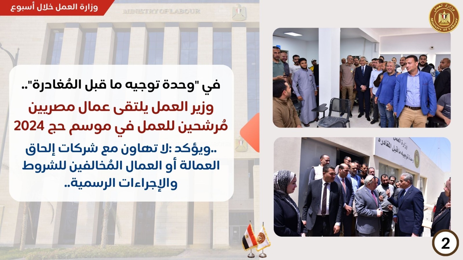 حصاد وزارة العمل: الوزارة تُصدر كتابًا دوريًا بشأن آليات تنفيذ قرار رفع الحد الأدنى لأجور عمال القطاع الخاص إلى 6000 جنيه، لقاء مع عمال مصريين مُرشحين للعمل في موسم حج 2024
