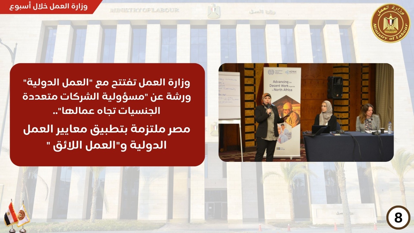وخلال الأسبوع،افتتحت وزارة العمل،ورشة عمل بعنوان "حوار من أجل نهج متماسك ومنسق لتعزيز الممارسات التجارية المستدامة والمسؤولة من أجل انتقال عادل في مصر"، بفندق تريومف بلازا مصر الجديدة، بالقاهرة، وذلك فى إطار مشروع النهوض بالعمل اللائق فى شمال أفريقيا "أضواء"، والذى ينفذ بين الوزارة ومنظمة العمل الدولية ILO، واستكمالًا للجهود المشاركة بين الطرفين، حيث تبنت الوزارة إعلان منظمة العمل الدولية للشركات متعددة الجنسيات.