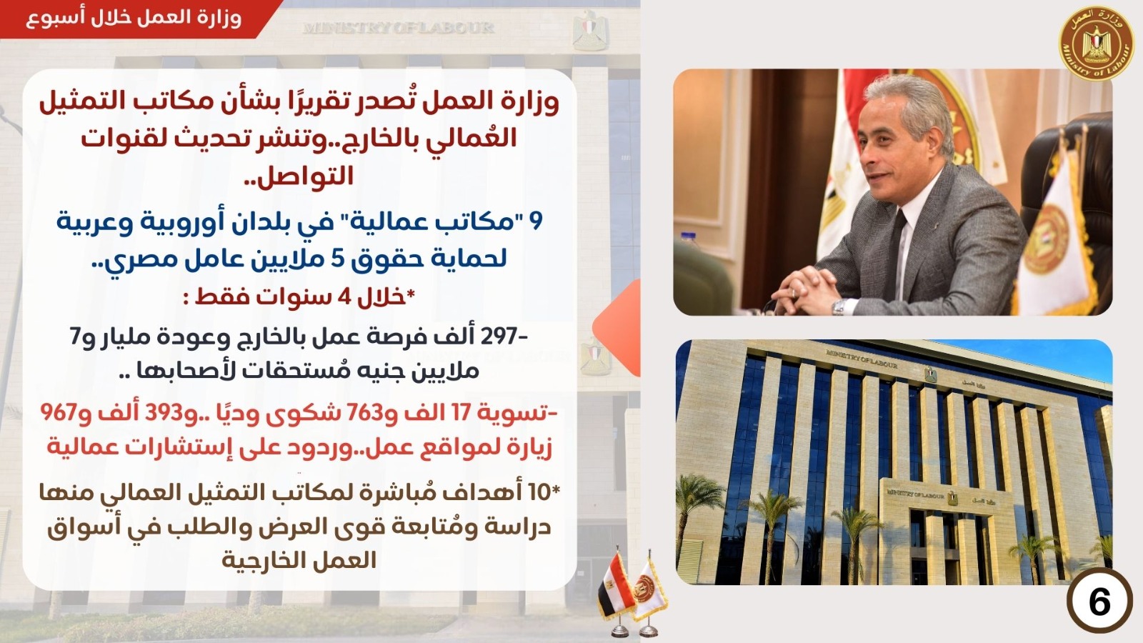 وأكدت وزارة العمل في تقرير لها على استمرار جهود 9 مكاتب تمثيل عمالي تابعة للوزارة في 8 بلدان أوروبية وعربية،في تقديم الحماية والرعاية لما يقرب من 5 ملايين عامل مصر - بالتحديد 4 ملايين و48 ألف عامل مصري- يعملون في نطاق تلك "المكاتب"،راصدًا تفعيل أهداف ودور"المكاتب الخارجية"،خلال تلك المرحلة،تنفيذًا لتوجيهات وزير العمل حسن شحاتة..