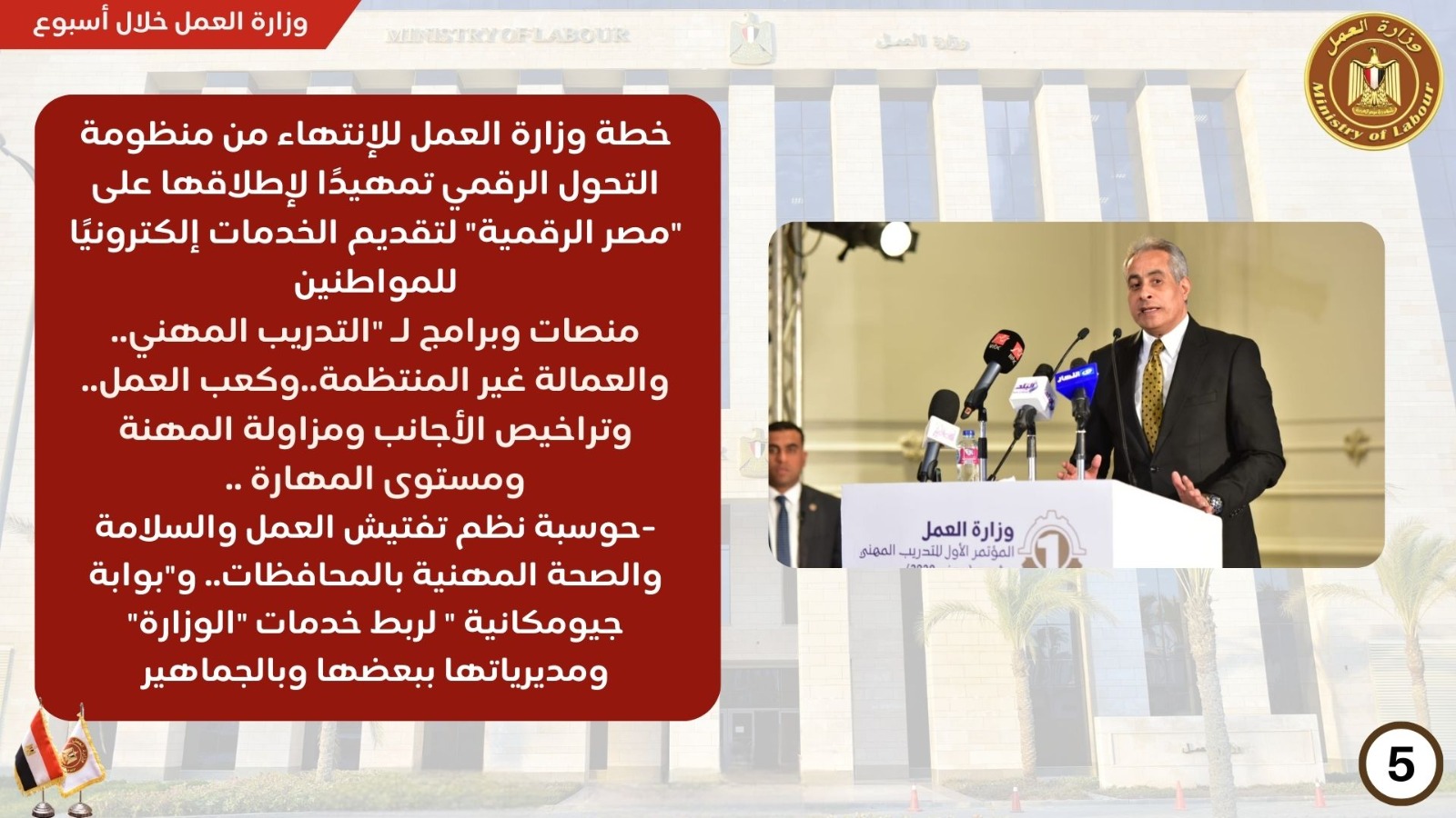 تواصل الإدارات المُختصة بوزارة العمل تنفيذ توجيهات وزير العمل حسن شحاتة - بحسب بيان صحفي - بسرعة الإنتهاء من إطلاق كافة الخدمات المُقدمة للمواطنين إلكترونيًا،وبشكل كامل،من بينها خدمات: كعب العمل،وتراخيص مزاولة المهنة، وشهادات قياس مستوى المهارة، وتراخيص عمل الأجانب فى مصر،وكذلك منظومة العمالة غير المُنتظمة،وغيرها من الخدمات،وذلك في إطار خطة الدولة نحو التحول الرقمى وعالم التكنولوجيا، وتماشيًا مع المُتغيرات التى طرأت على سوق العمل المحلى والدولى..حيث يُعد تحويل منظومة العمالة غير المنتظمة إلى أخرى رقمية على سبيل المثال، أحد أهم تلك المشروعات التى تعمل الوزارة على الانتهاء منها خلال الفترة القليلة المُقبلة، فضلًا عن الإنتهاء من كافة مراحل "البوابة الجيومكانية المعلوماتية" لمُؤشرات أداء وزارة العمل GIS"، بالإضافة إلى منصة للتدريب المهنى،تمهيدًا لإطلاق تلك الخدمات وغيرها على "منصة مصر الرقمية"..
