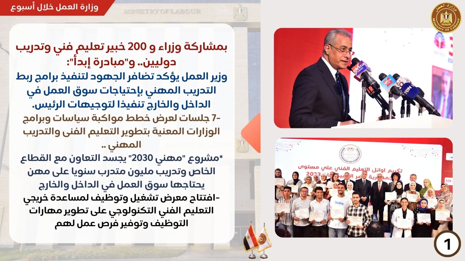 أكد وزير العمل حسن شحاتة على أهمية تضافر الجهود،وتكثيف التعاون بين شركاء العمل والتنمية من أجل تنفيذ خطط وبرامج بربط التعليم،والتدريب المهني باحتياجات سوق العمل في الداخل والخارج.. وتطرق الوزير إلى "مشروع مهني 2030"،الذي أطلقته وزارة العمل منتصف يناير الماضي،بالتعاون مع القطاع الخاص،لتطوير منظومة التدريب المهني،وتأهيل مليون متدرب سنويا بمهارات عالمية،على احتياجات" السوق"، تنفيذا لتوجيهات الرئيس عبدالفتاح السيسي رئيس الجمهورية..