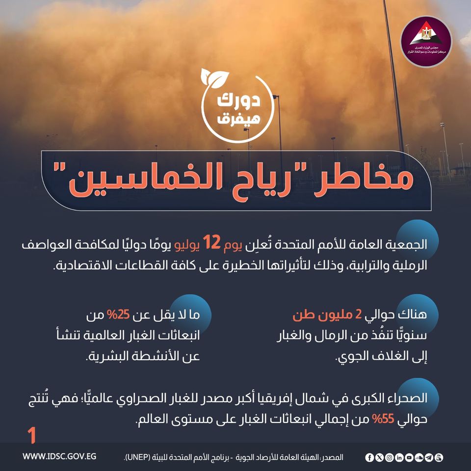 كشفت الصفحة الرسمية لمركز المعلومات ودعم اتخاذ القرار بمجلس الوزراء على موقع التواصل الاجتماعي "فيسبوك" عن مخاطر رياح الخماسين.