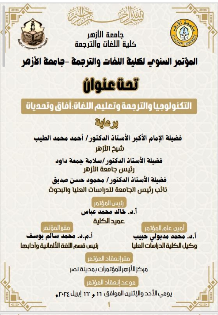 تعقد كلية اللغات والترجمة بنين بجامعة الأزهر في القاهرة مؤتمرها العلمي السنوي تحت عنوان: «التكنولوجيا والترجمة وتعليم اللغات: آفاق وتحديات»، وذلك يومي: الأحد والإثنين ٢١_٢٢ من شهر إبريل الحالي، في تمام التاسعة صباحًا بمركز الأزهر للمؤتمرات بمدينة نصر.