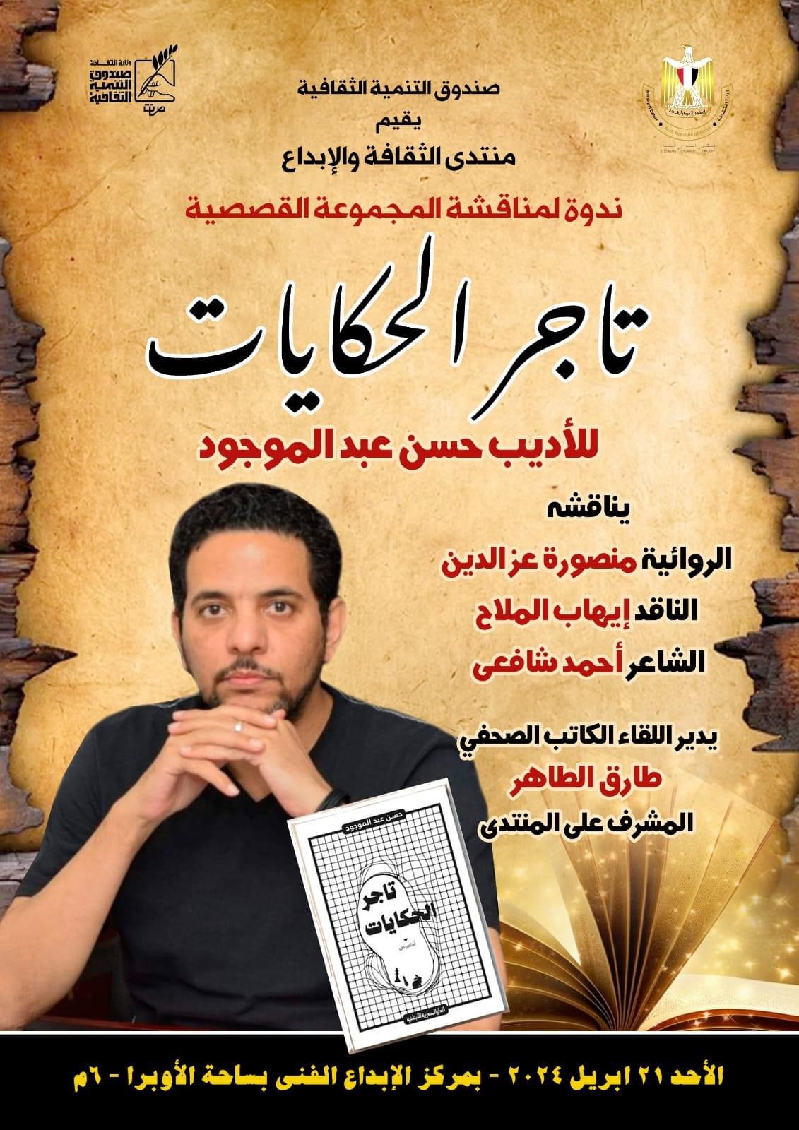 ويناقش المنتدى المجموعة القصصية "تاجر الحكايات" للأديب حسن عبد الموجود، ويناقشه كل من الروائية منصورة عز الدين، الناقد إيهاب الملاح، الشاعر والمترجم أحمد شافعى.