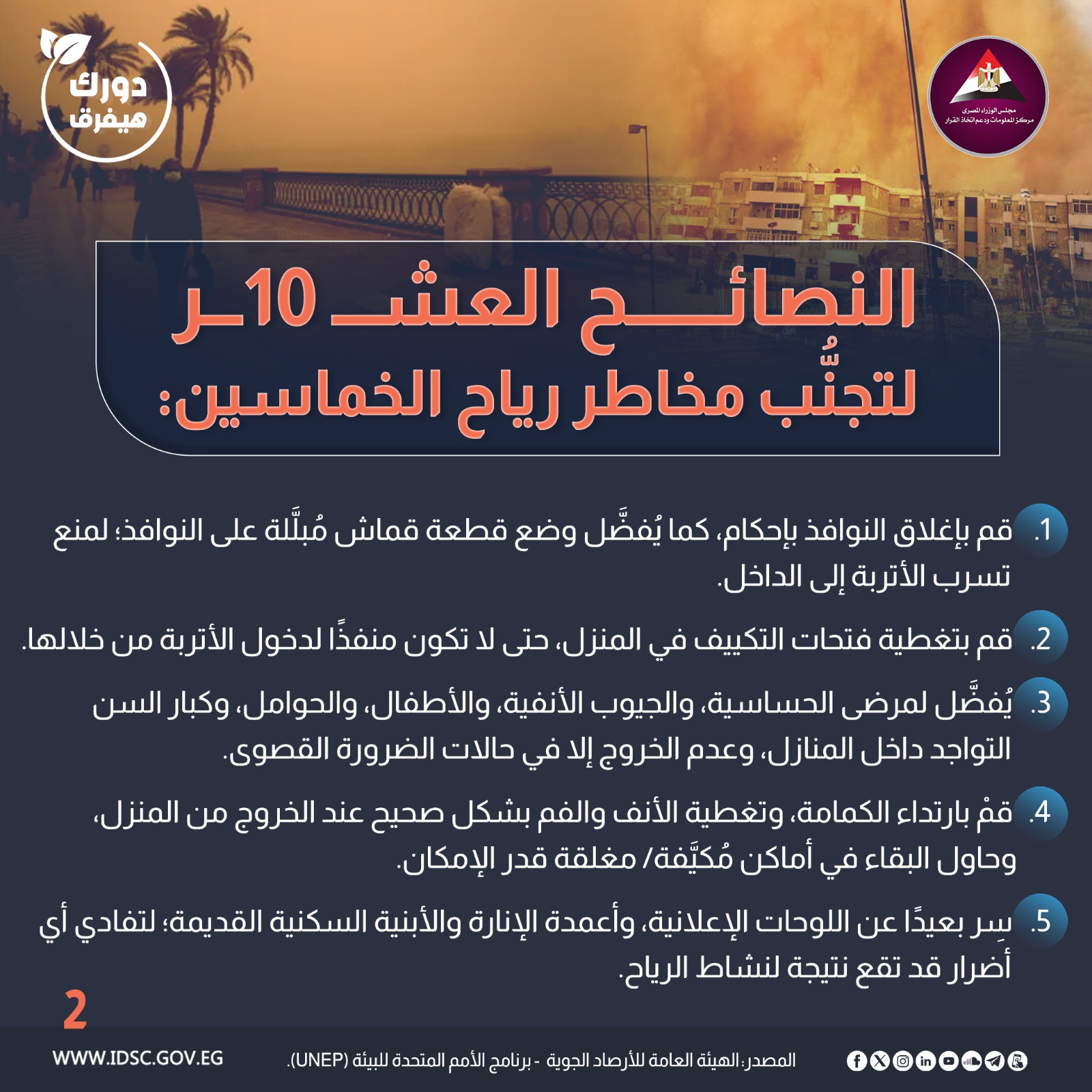 مجموعة من النصائح لتجنُب مخاطر رياح الخماسين والعواصف الرملية والترابية