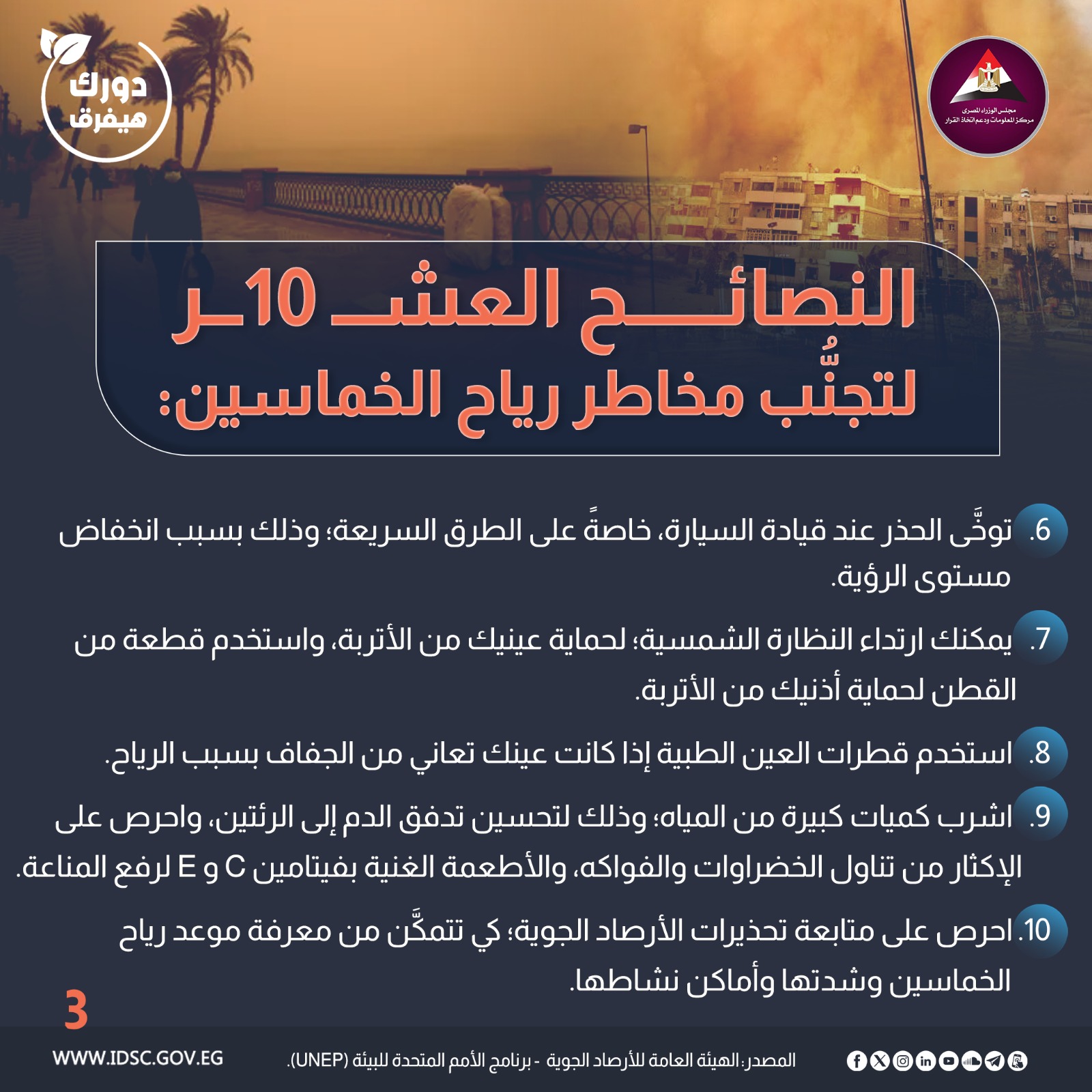 يقدم الإنفوجراف التالي مجموعة من النصائح لتجنُب مخاطر رياح الخماسين والعواصف الرملية والترابية.