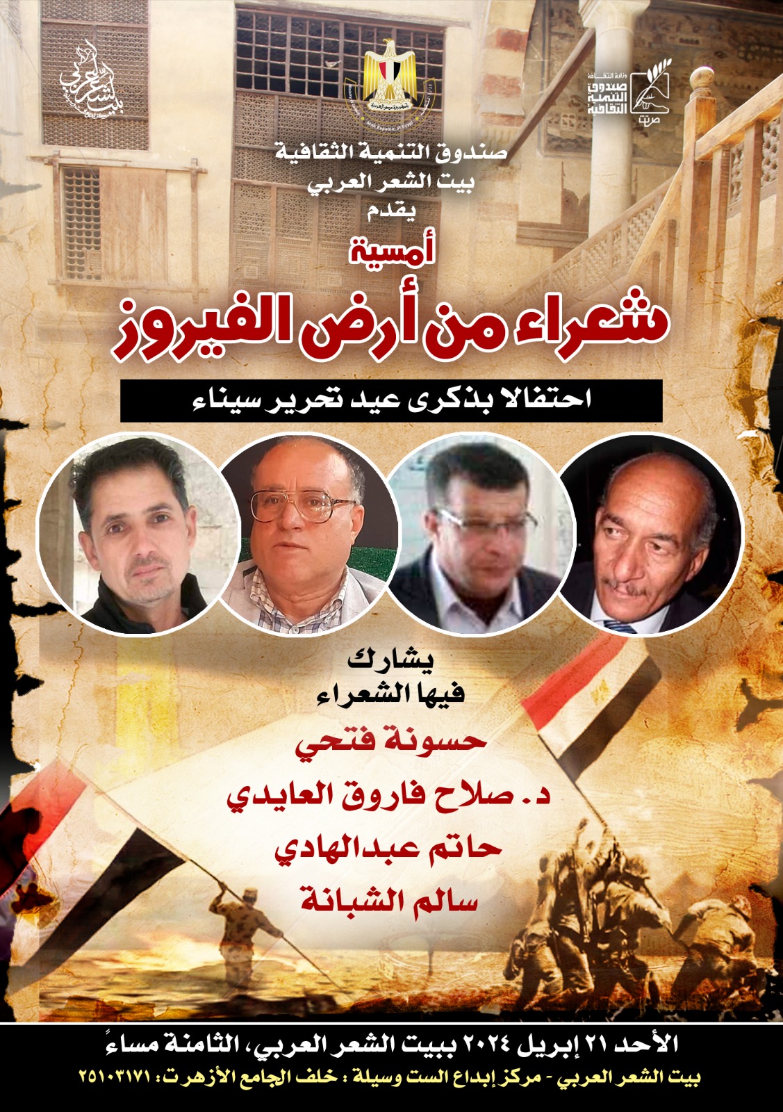 يقيم بيت الشعر العربي بمركز إبداع بيت الست وسيلة، التابع لصندوق التنمية الثقافية برئاسة الدكتور وليد قانوش، أمسية شعرية بعنوان "شعراء من أرض الفيروز"، احتفالا بعيد تحرير سيناء، في تمام الثامنة من مساء اليوم الأحد الموافق 21 أبريل الجاري.