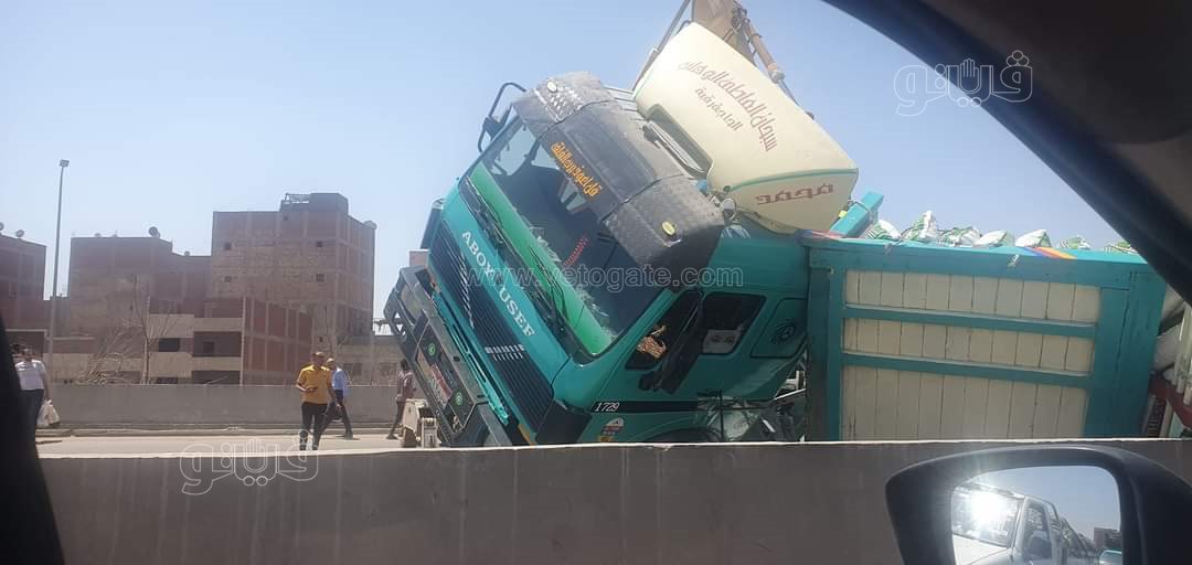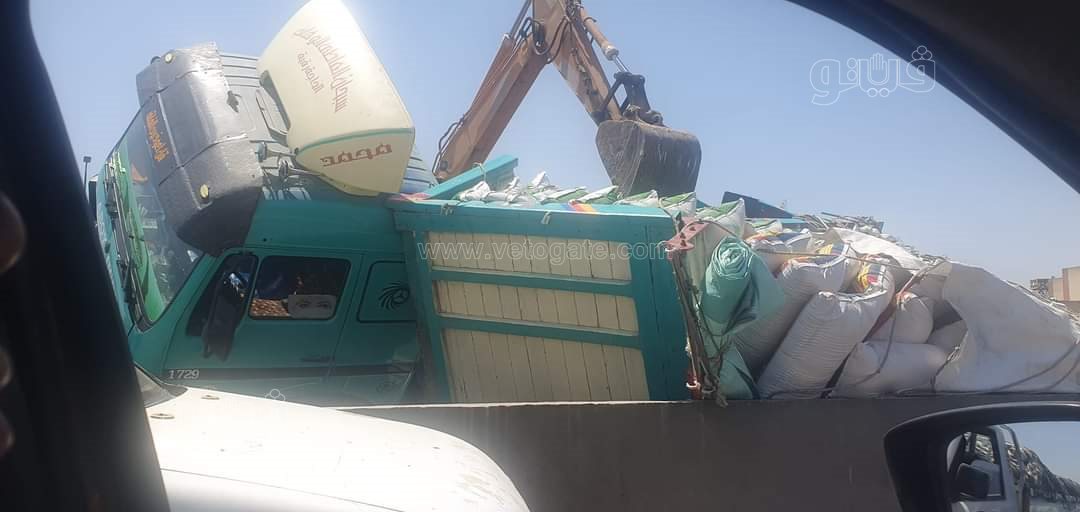 انقلاب سيارة نقل محملة بمواد غذائية أعلى دائري ميدان لبنان (صور)