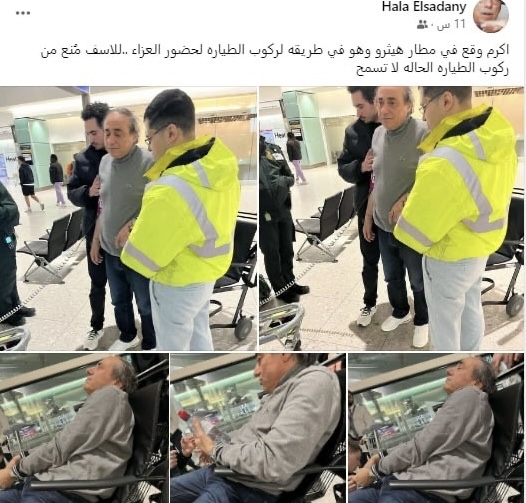 ونشرت هالة السعدني صور لـ شقيقها أكرم من مطار هيثرو بالعاصمة البريطانية لندن، وعلقت عليها قائلة: "أكرم وقع في مطار هيثرو وهو في طريقه لركوب الطيارة لحضور العزاء.. للأسف مُنع من ركوب الطيارة الحالة لا تسمح".