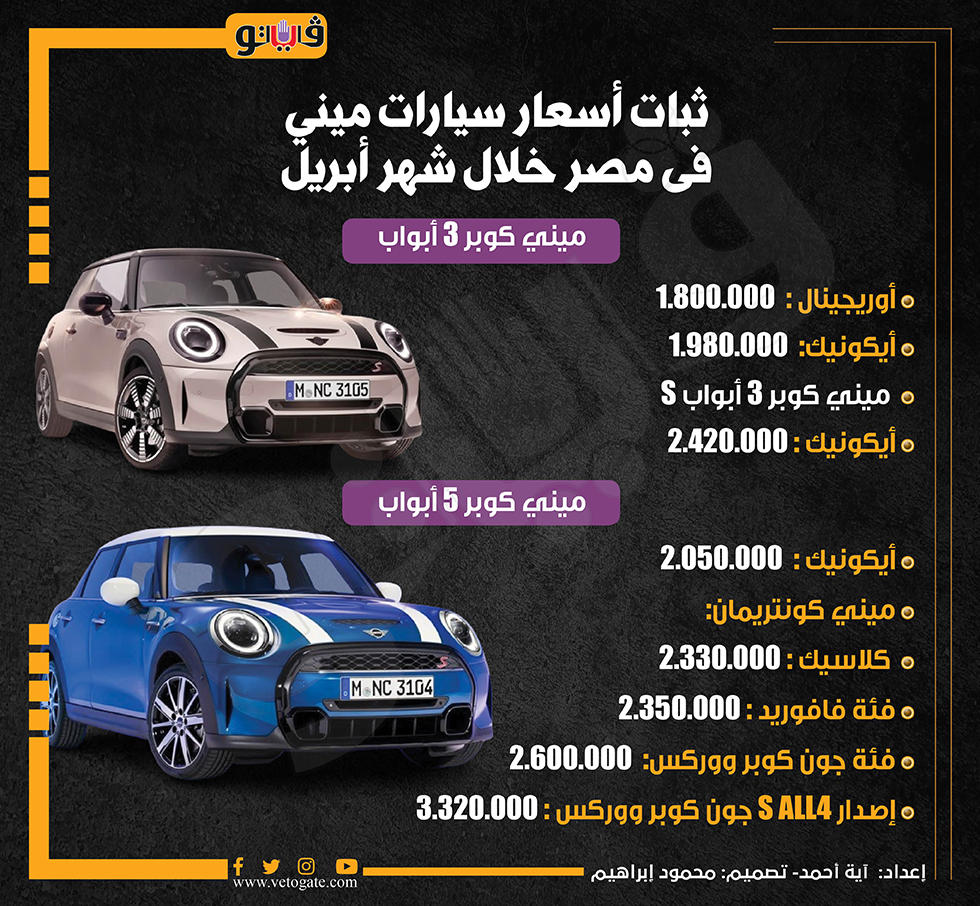 ثبات أسعار سيارات ميني في مصر خلال شهر أبريل (إنفوجراف) الثلاثاء 23/أبريل/2024 - 09:14 ص 4/23/2024 9:14:12 AM سيارات آية أحمد شارك طباعة 18 حجم الخط شارك طباعة ميني كوبر 3 ميني كوبر فوري ايكون أوريجي