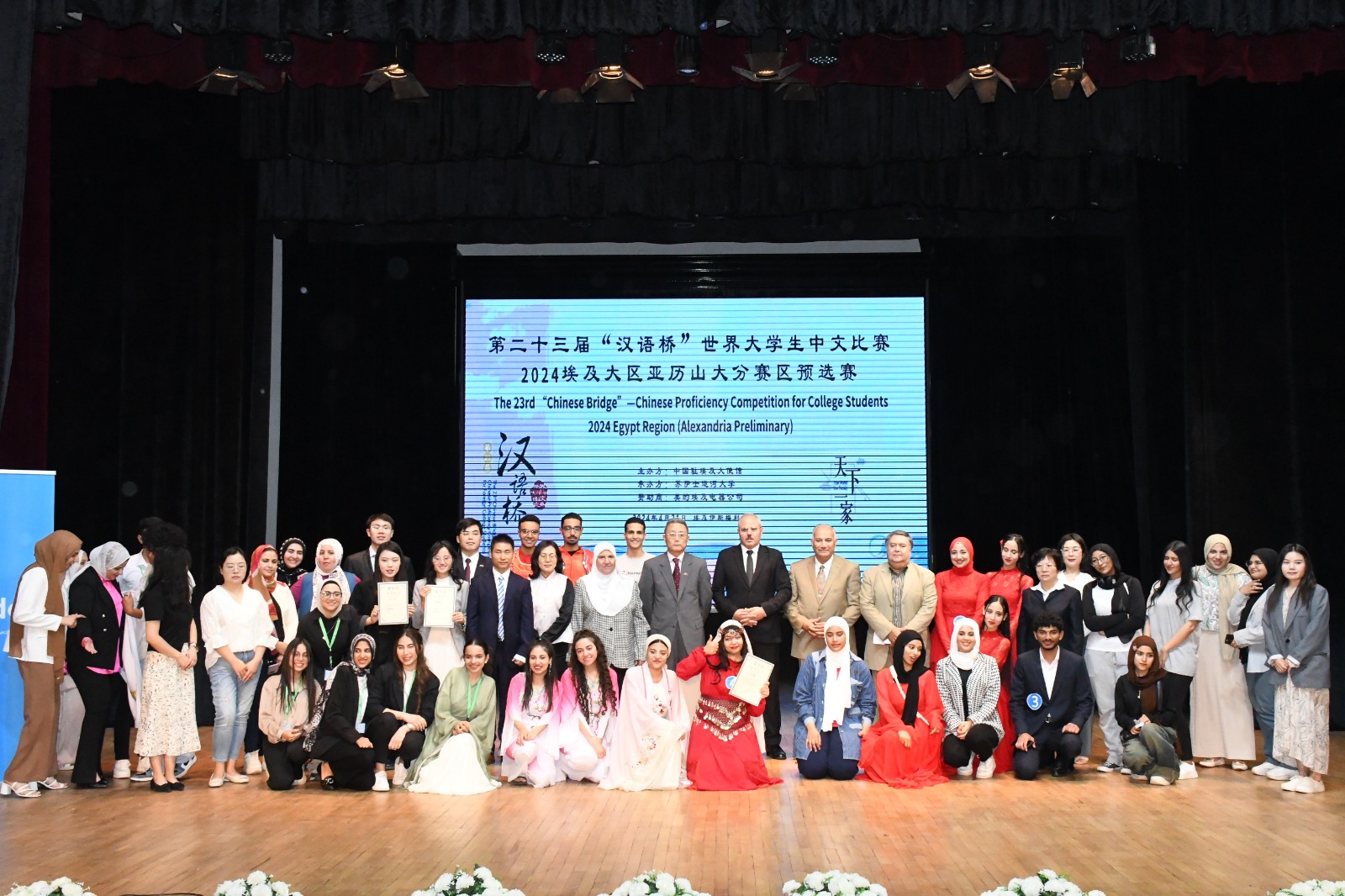 ومن جانبه رحب الدكتور ناصر مندور رئيس الجامعة بالقنصل العام للقنصلية الصينية بالإسكندرية والوفد المرافق له، ولجنة التحكيم، وعمداء ورؤساء أقسام اللغة الصينية بالجامعة والطلاب، والمتسابقين من جامعة قناة السويس وجامعة الإسكندرية.