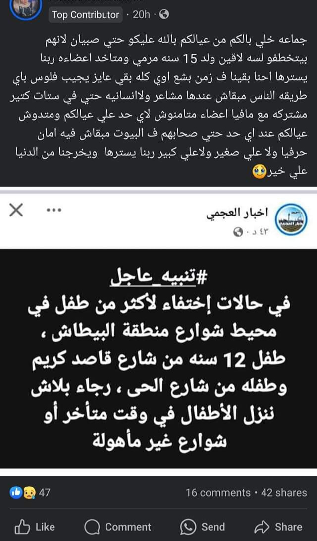 وكان قد جرى تداول منشورات علي صفحات خاصة بحي العجمي تحذر من وجود حالات اختفاء واختطاف للأطفال بنطاق حي العجمي بمنطقة البيطاش في شارع الحي وقاعد كريم والعثور علي جثة طفل ١٥ عاما منزوع الأعضاء، وحذرت المنشورات من ترم الأطفال أو نزولهم في الشارع خوفا عليهم من الاختفاء والخطف، وهو ما تم نفيه من قسم شرطة الدخيلة والأجهزة الأمنية.