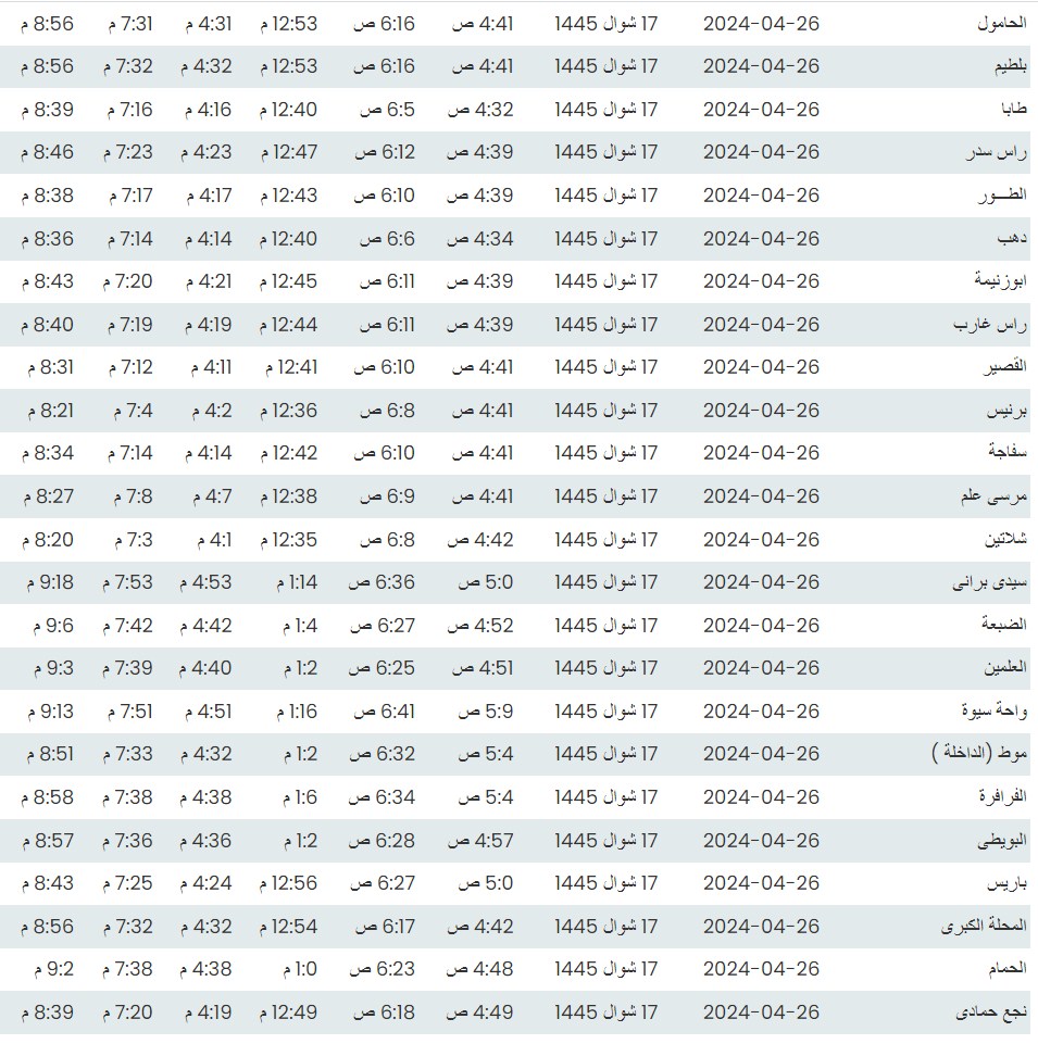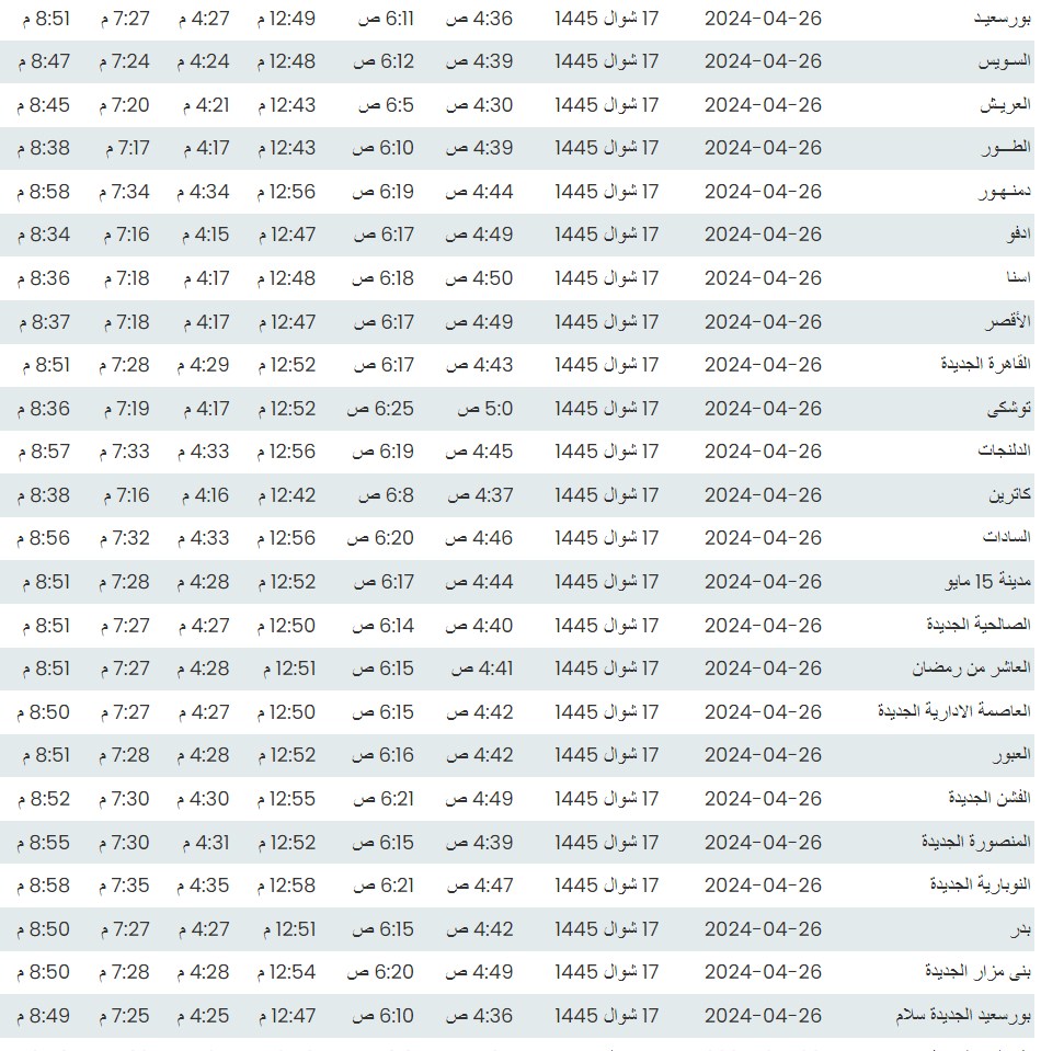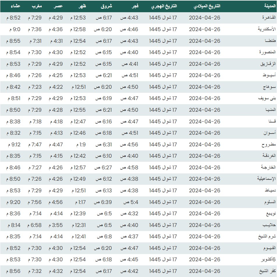 مواقيت الصلاة اليوم وفقًا للتوقيت المحلي لمدينتي القاهرة والإسكندرية وكذلك،مواقيت الصلاة، لعدد من مدن ومحافظات الجمهورية من واقع بيانات الهيئة العامة للمساحة