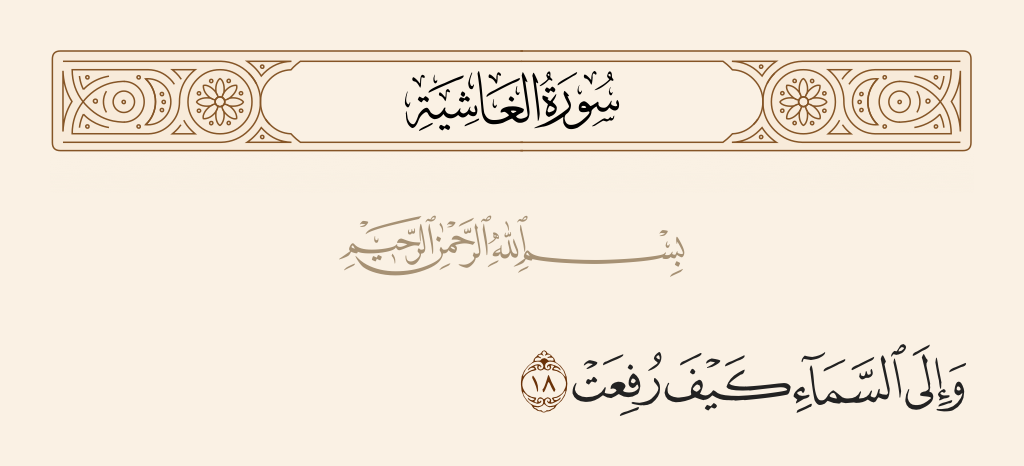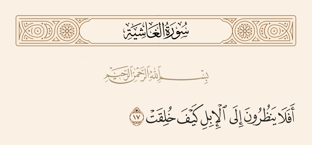 قال تعالى: «أَفَلا يَنْظُرُونَ إِلَى الْإِبِلِ كَيْفَ خُلِقَتْ * وَإِلَى السَّماءِ كَيْفَ رُفِعَتْ * وَإِلَى الْجِبالِ كَيْفَ نُصِبَتْ * وَإِلَى الْأَرْضِ كَيْفَ سُطِحَتْ» (الآيات 17: 20).