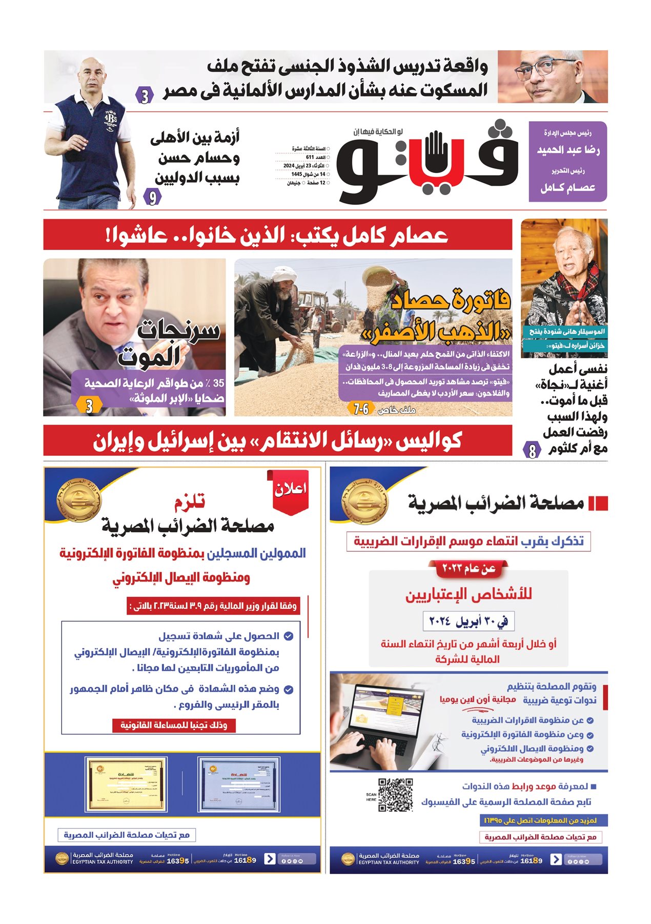 تنشر فيتو في عددها الورقي الجديد، مجموعة من الموضوعات المهمة التى تشغل الرأى العام سواء فى مصر أو على المستوى العالمي أبرزها موضوع مدعم بمعلومات تفصيلية تحت عنوان: " كواليس رسائل الانتقام بين إسرائيل وإيران"، وملف مصور عن موسم حصاد القمح المحلي بعنوان "فاتورة حصاد الذهب الأصفر".. ويتضمن العدد أيضا موضوعا مهما عن مخاطر استخدام السرنجات الملوثة بعنوان "سرنجات الموت"