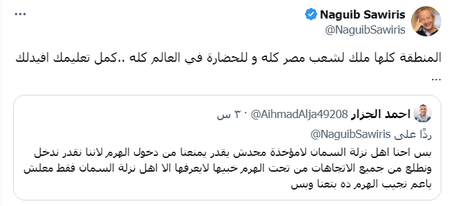 وقال مهندس نجيب ساويرس تعليقًا على من يدعى أن منطقة الأهرامات ملكية خاصة بهم: "المنطقة كلها ملك لشعب مصر كله وللحضارة في العالم كله..كمل تعليمك افيدلك".