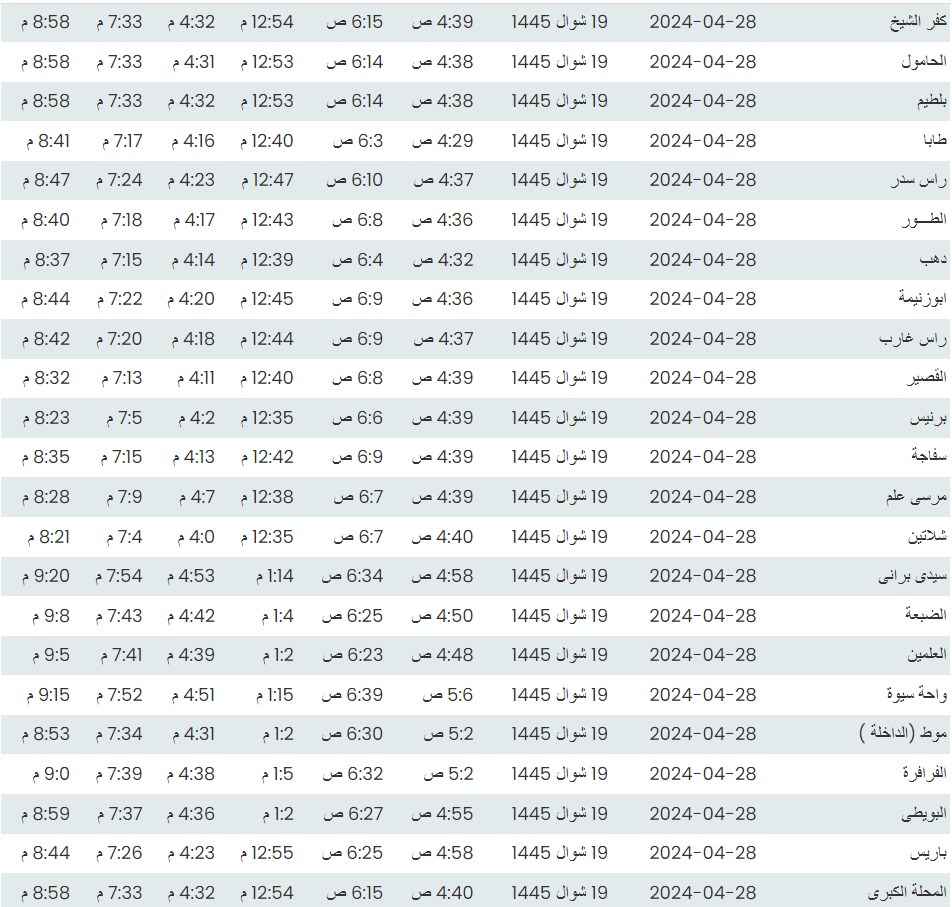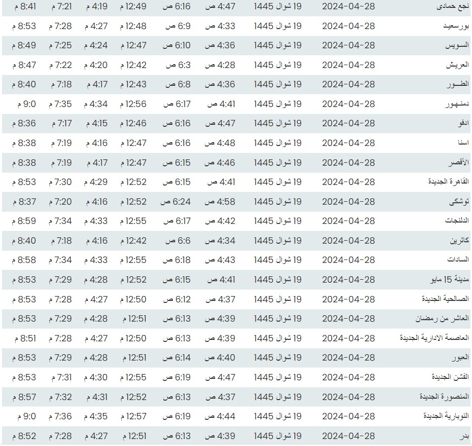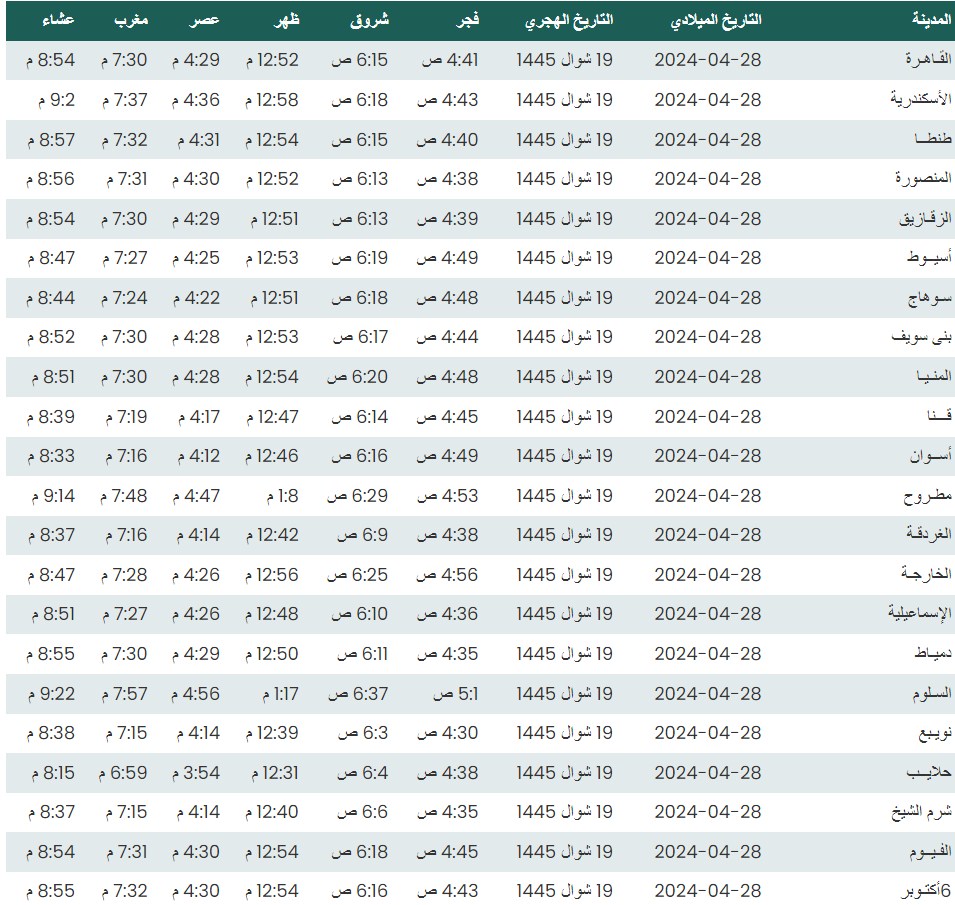 وفيما يلي مواقيت الصلاة، لعدد من مدن ومحافظات الجمهورية من واقع بيانات الهيئة العامة للمساحة