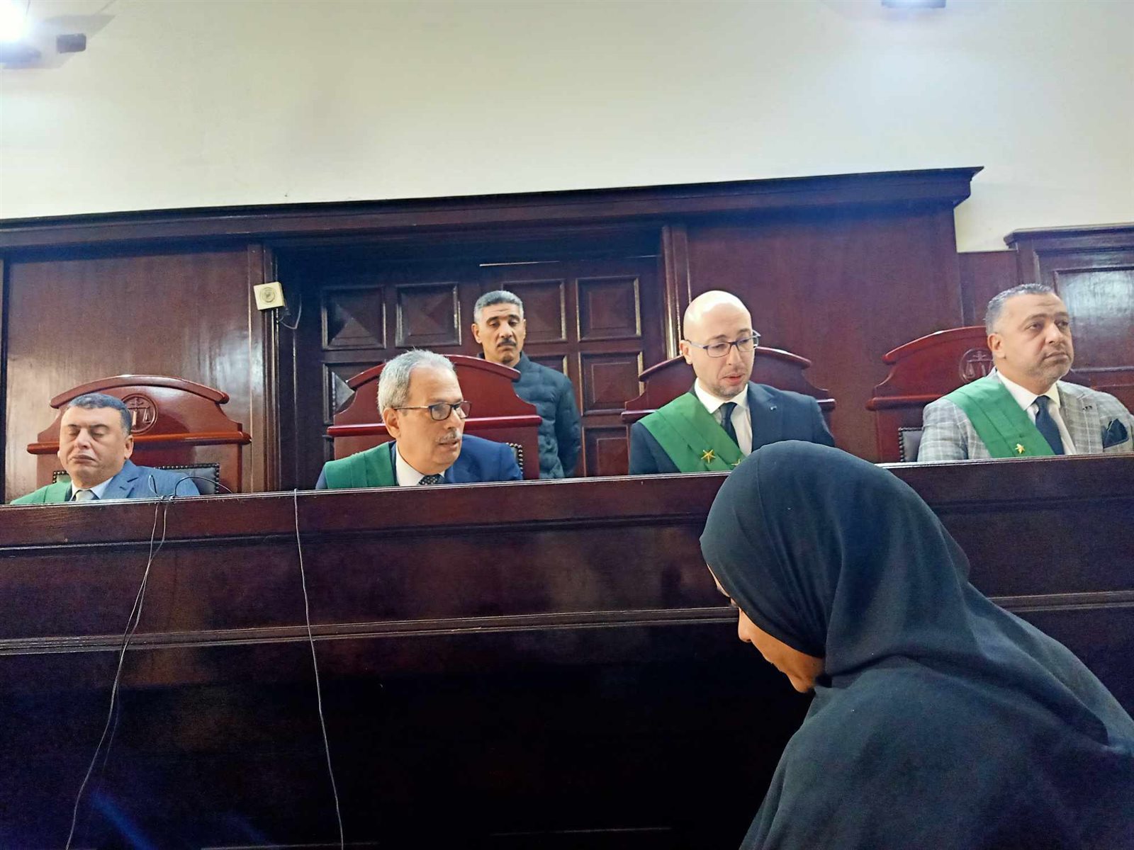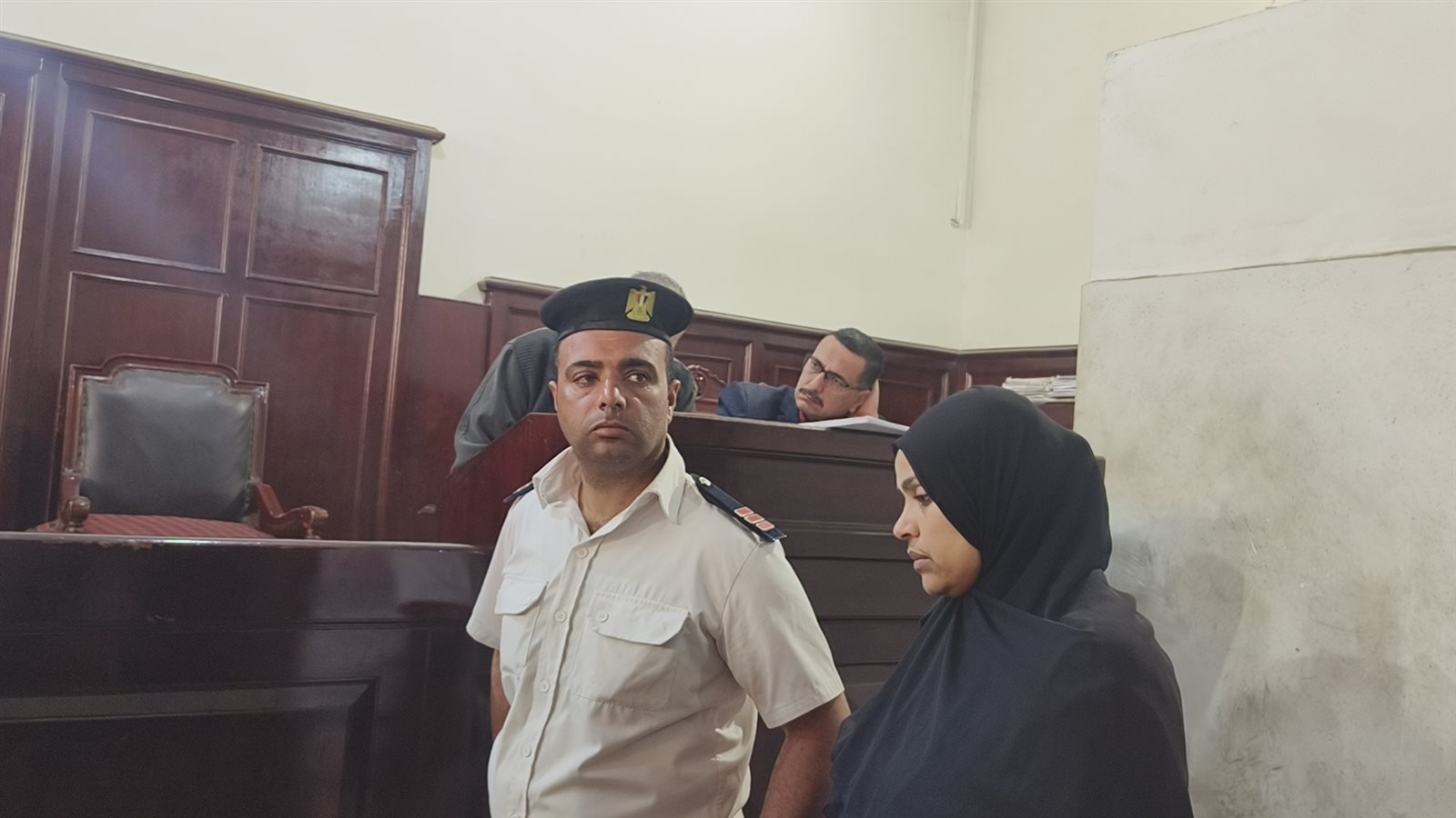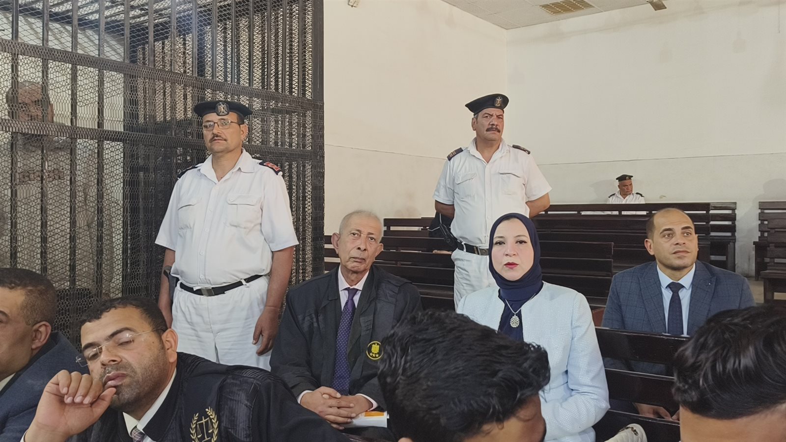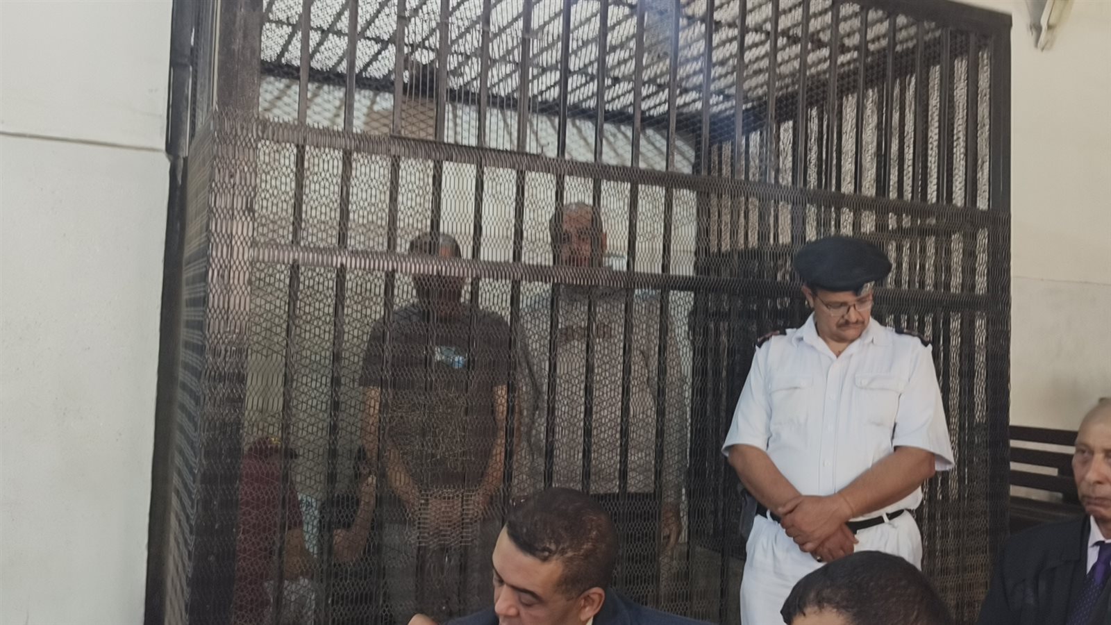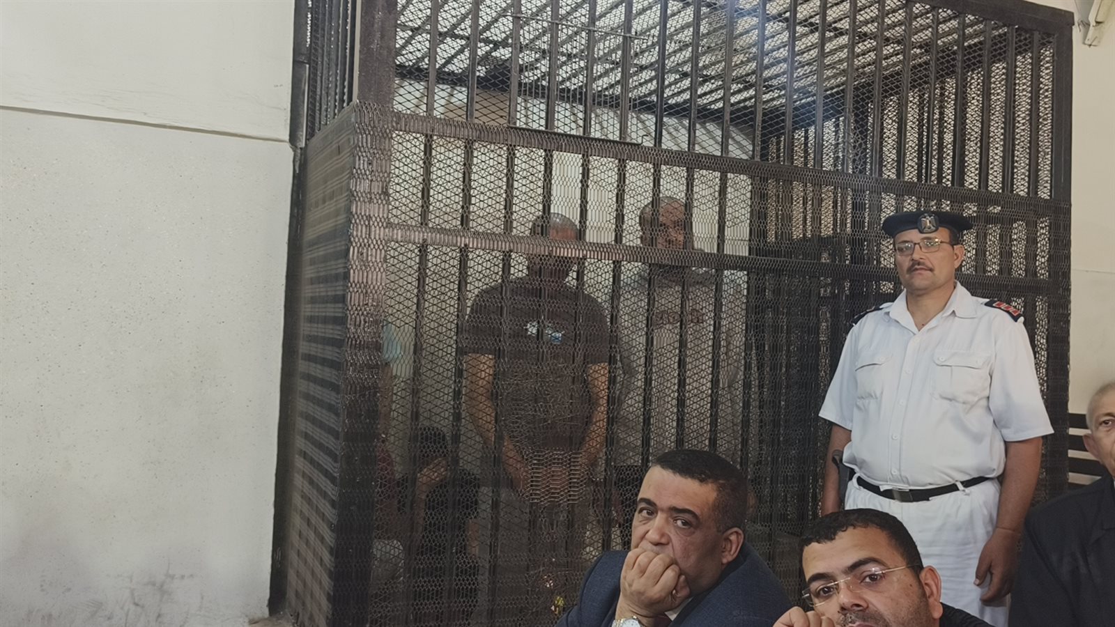 ومثل المتهمون الثلاثة بقفص الاتهام امام هيئة المحكمة.