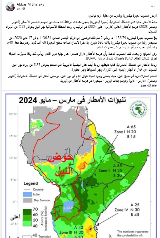 في تدوينة سابقة تحت عنوان "تنبؤات بموسم أمطار مرتفع على بحيرة فيكتوريا"، قال الدكتور عباس شراقي: “استمرارًا لحالة الأمطار المرتفعة عن المعدل في الموسم الماضي الأصغر (أكتوبر- ديسمبر 2023) على المنطقة الاستوائية (بحيرة فيكتوريا) التي تمد النيل بحوالي 15%، فإن أمطار الموسم الأكبر الحالي (مارس - مايو 2024)”.