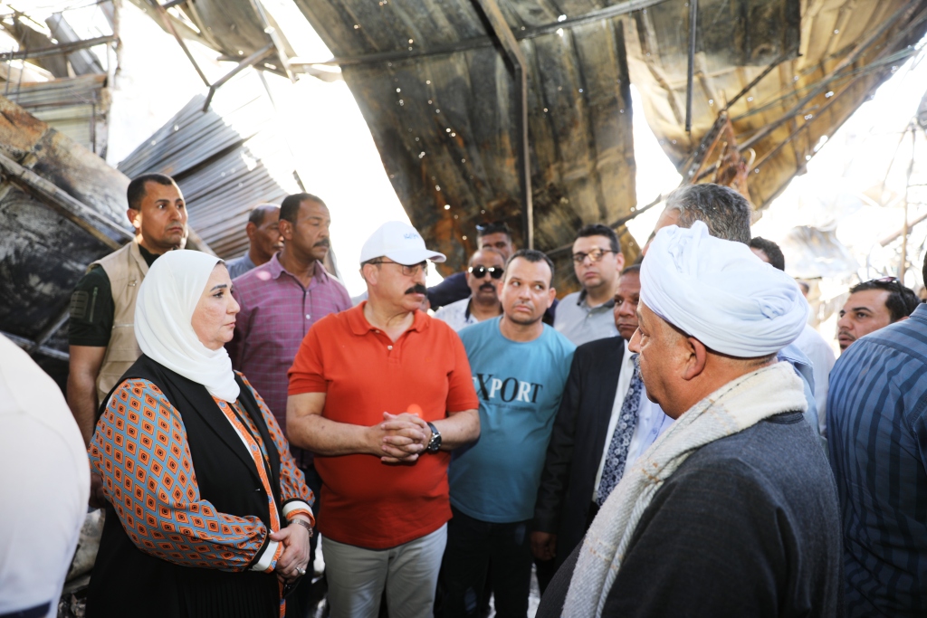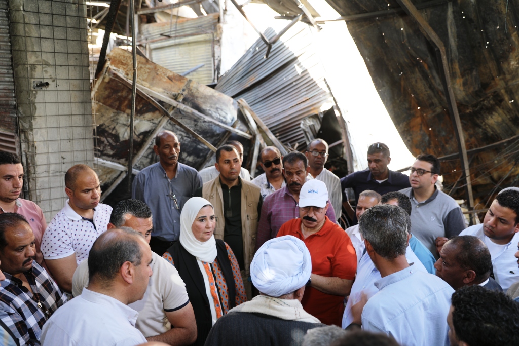 وزيرة التضامن الاجتماعى ومحافظ أسوان يلتقيان بأصحاب المحال التجارية المتضررين من حريق مول فيله (صور)