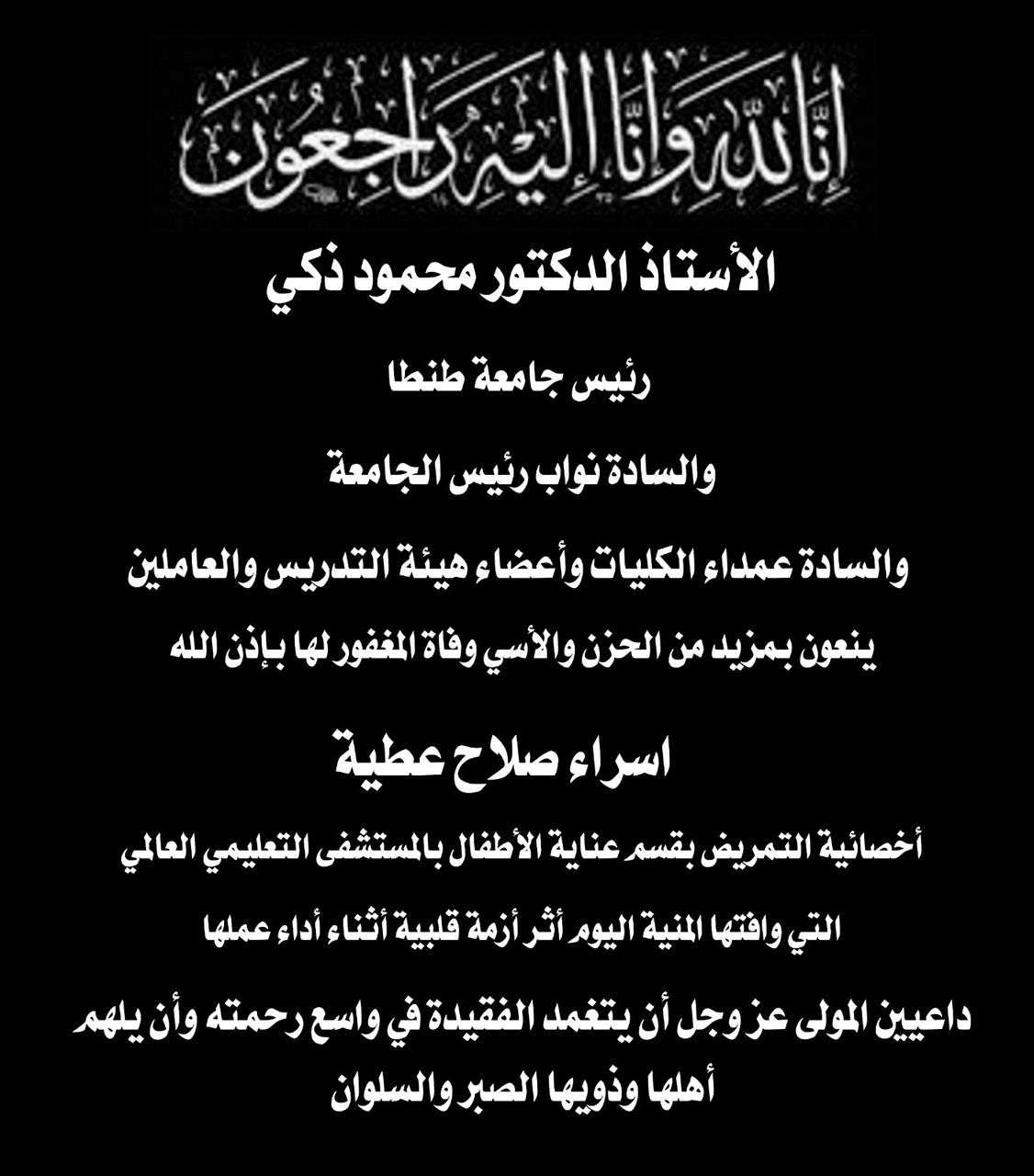 يتقدم الدكتور محمود ذكي رئيس جامعة طنطا ونواب رئيس الجامعة وعمداء الكليات وأعضاء هيئة التدريس والعاملين بخالص التعازي والمواساة في وفاة المغفور لها بإذن الله إسراء صلاح عطية أخصائية التمريض بقسم عناية الأطفال بالمستشفى التعليمي العالمي التي وافتها المنية اليوم إثر أزمة قلبية أثناء أداء عملها.
