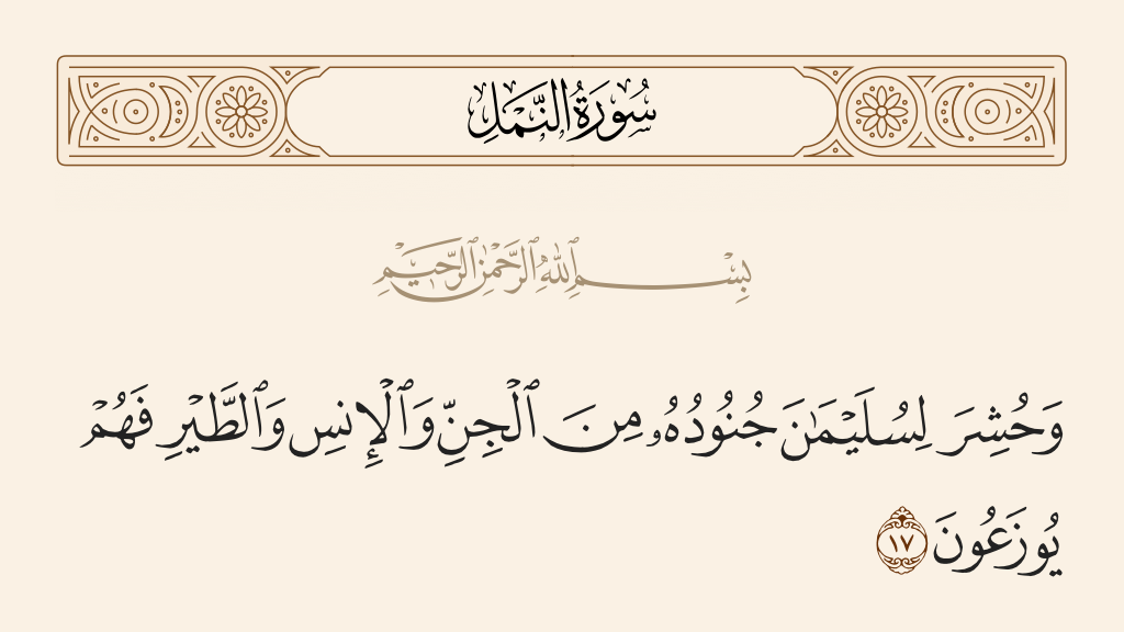 قال تعالى: «وَحُشِرَ لِسُلَيْمَانَ جُنُودُهُ مِنَ الْجِنِّ وَالْإِنْسِ وَالطَّيْرِ فَهُمْ يُوزَعُونَ».