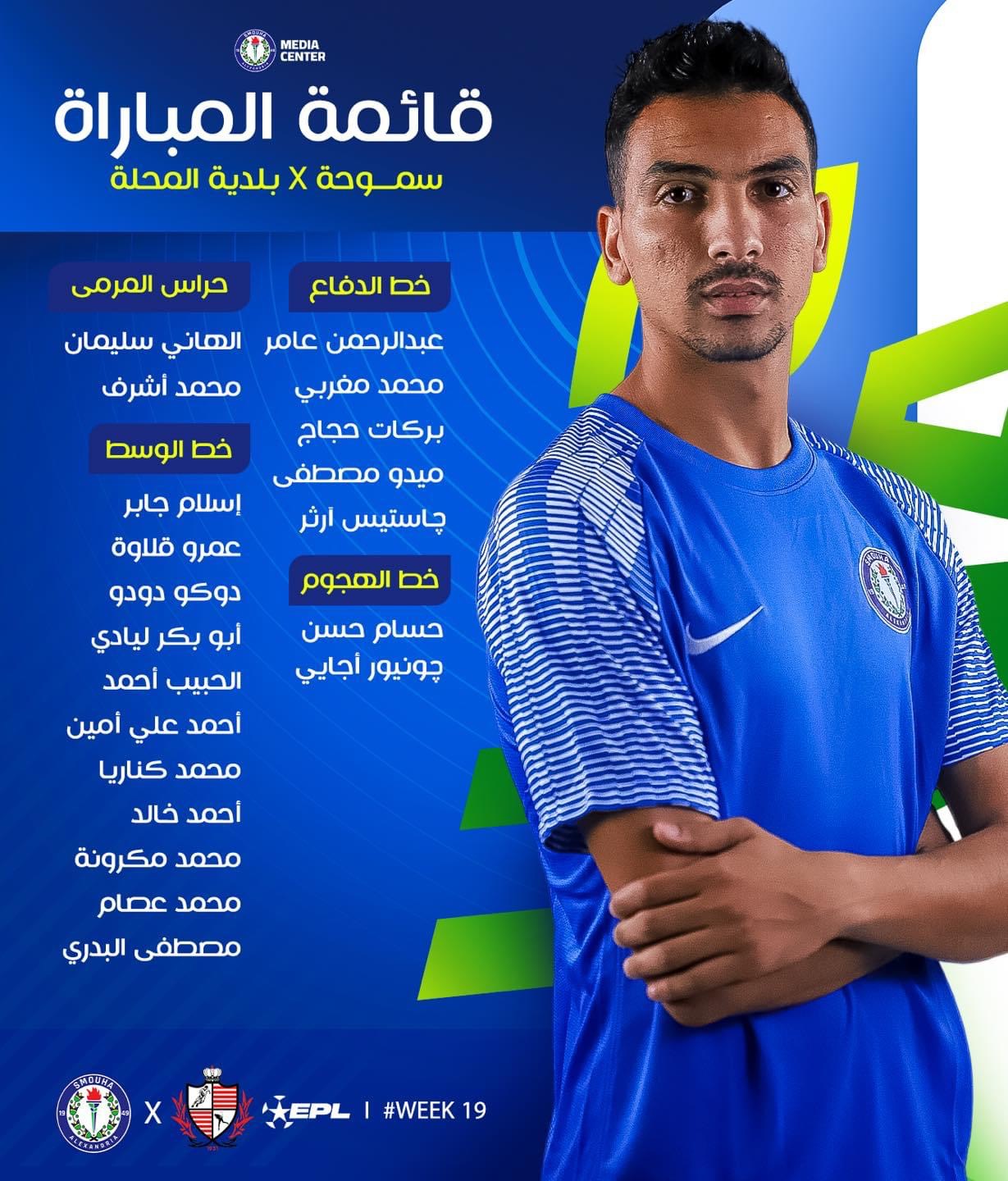 أعلن الكابتن أحمد سامي المدير الفني لنادي سموحة عن قائمة فريقه لمواجهة نادي بلدية المحلة غدًا الثلاثاء على ستاد الإسكندرية في إطار الجولة الـ19 من الدوري المصري الممتاز.