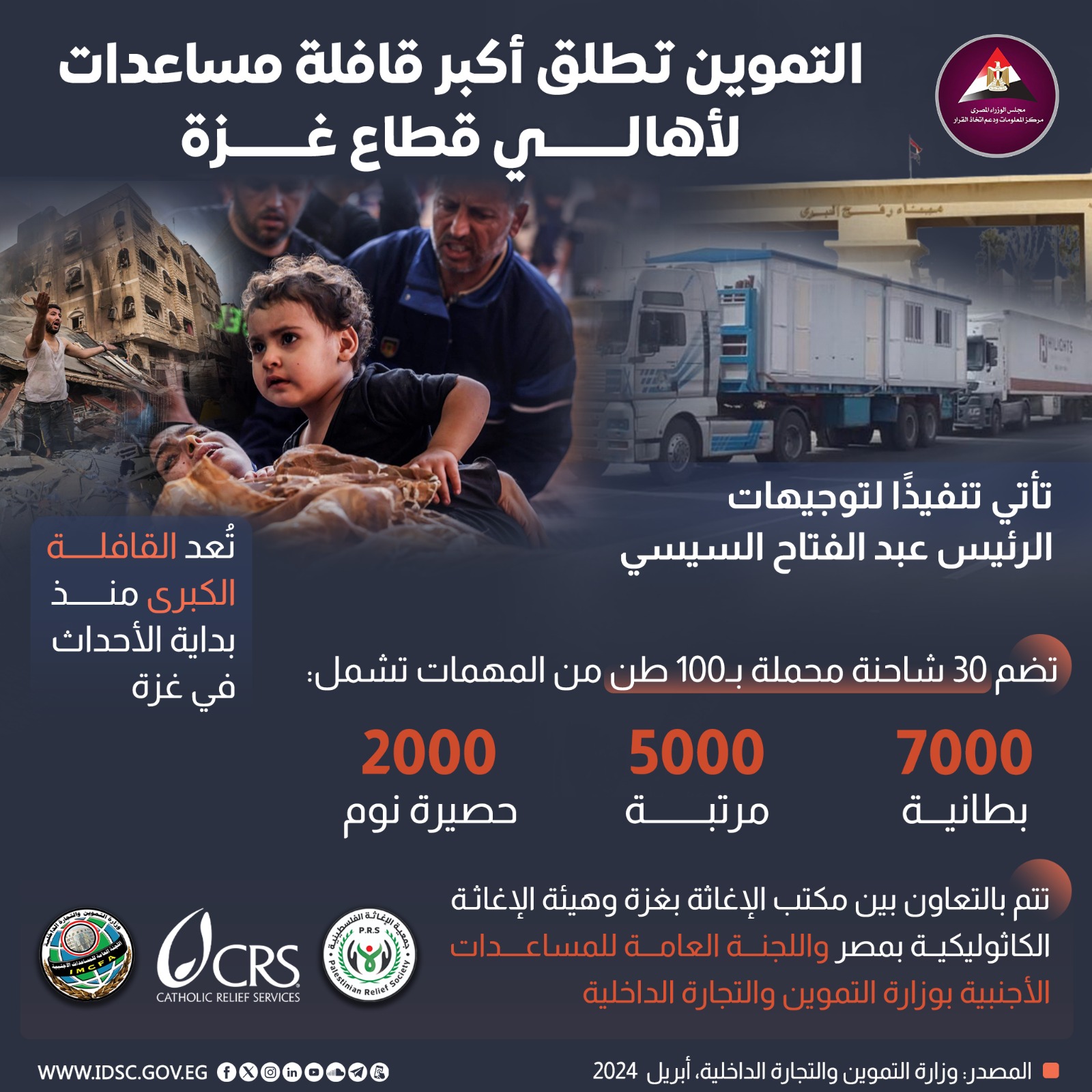 كشفت الصفحة الرسمية لمركز المعلومات ودعم اتخاذ القرار بمجلس الوزراءعلى موقع التواصل الاجتماعي "فيسبوك" عن أكبر قافلة مساعدات أطلقتها وزارة التموين لأهالي قطاع غزة.