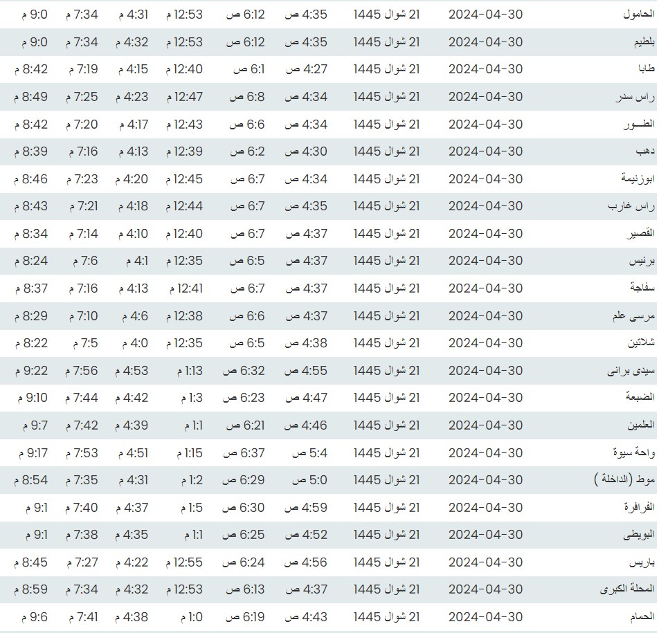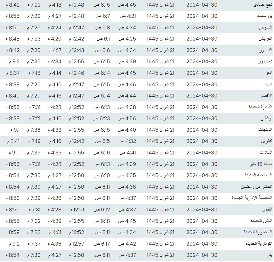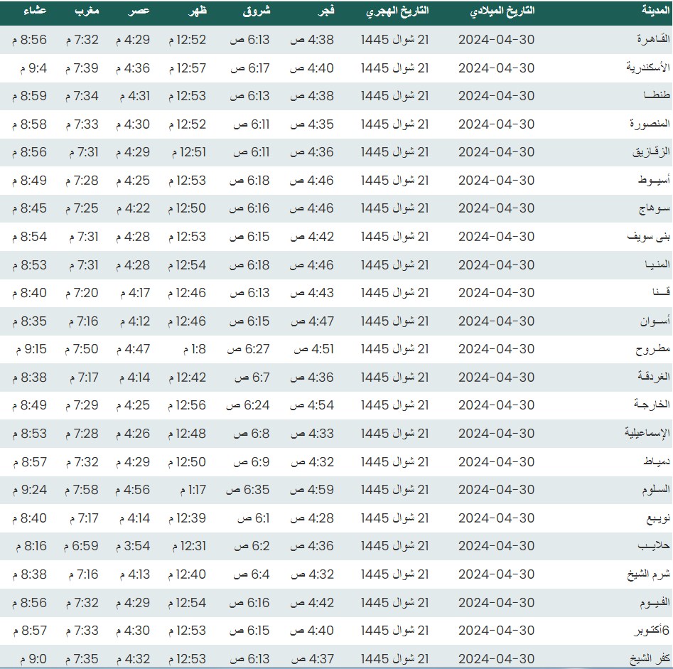 وفيما يلي مواقيت الصلاة، لعدد من مدن ومحافظات الجمهورية من واقع بيانات الهيئة العامة للمساحة