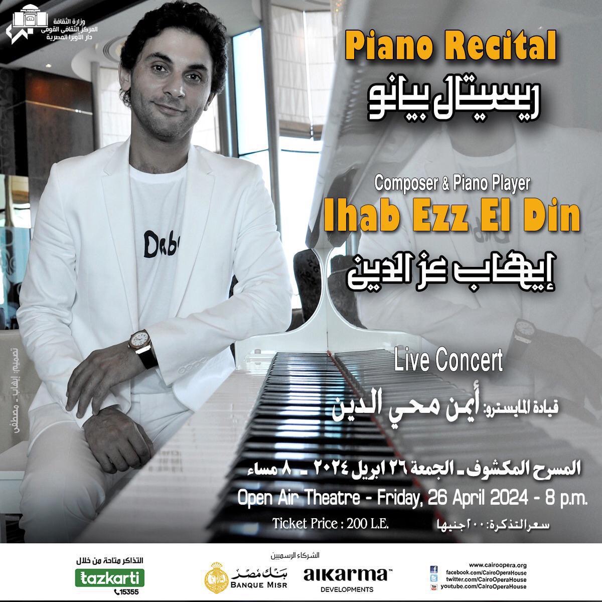 تنظم دار الأوبرا المصرية حفلا لأعمال المؤلف الموسيقي وعازف البيانو ايهاب عز الدين، بقيادة المايسترو أيمن محيي الدين وذلك في تمام الثامنة من مساء يوم الجمعة المقبل الموافق 26 أبريل الجاري، على المسرح المكشوف بالأوبرا.