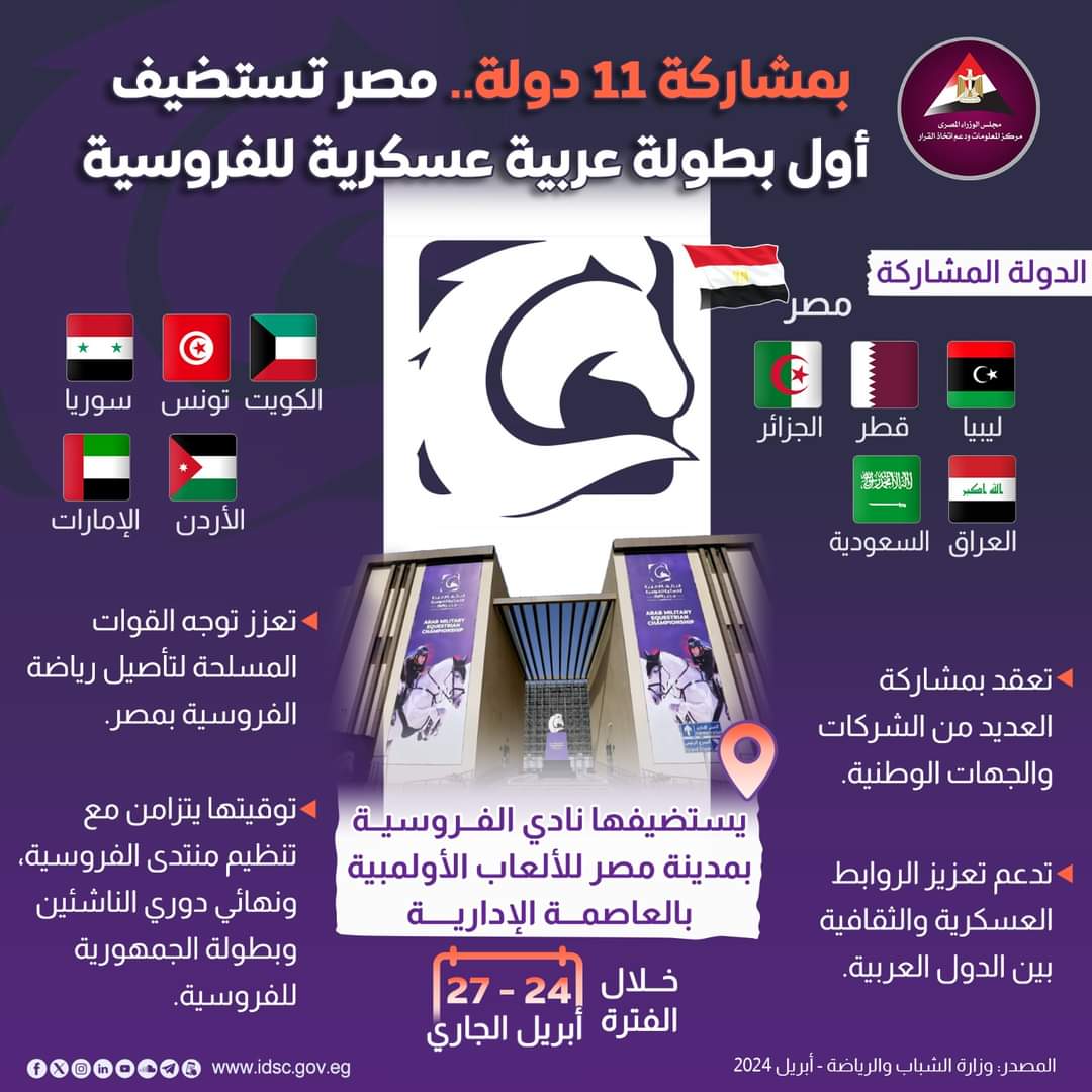 أعلنت الصفحة الرسمية لمركز المعلومات ودعم اتخاذ القرار بمجلس الوزراء على موقع التواصل الاجتماعي "فيسبوك" تفاصيل استضافة مصر لأول بطولة عربية عسكرية للفروسية.