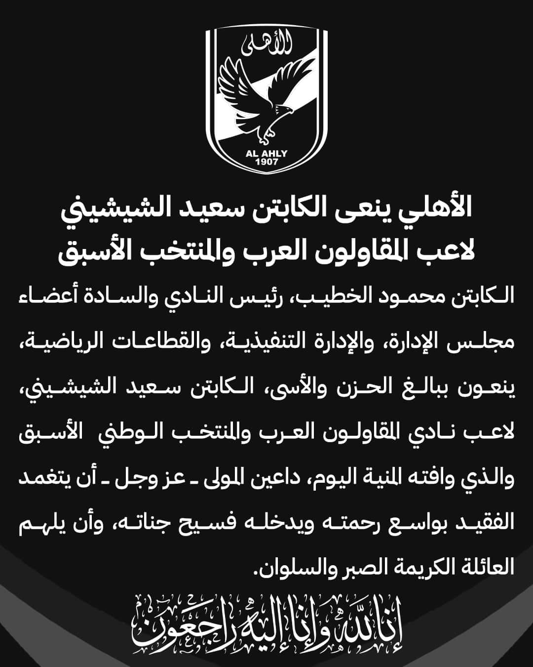 حرص مجلس إدارة النادي الأهلي، على نعي الكابتن سعيد الشيشيني لاعب المقاولون العرب السابق.