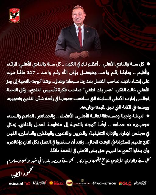 حرص الكابتن محمود الخطيب رئيس النادي الأهلي على تقديم التهنئة لجميع مشجعي النادي الأحمر بمناسبة ذكرى تأسيسه الـ 117.