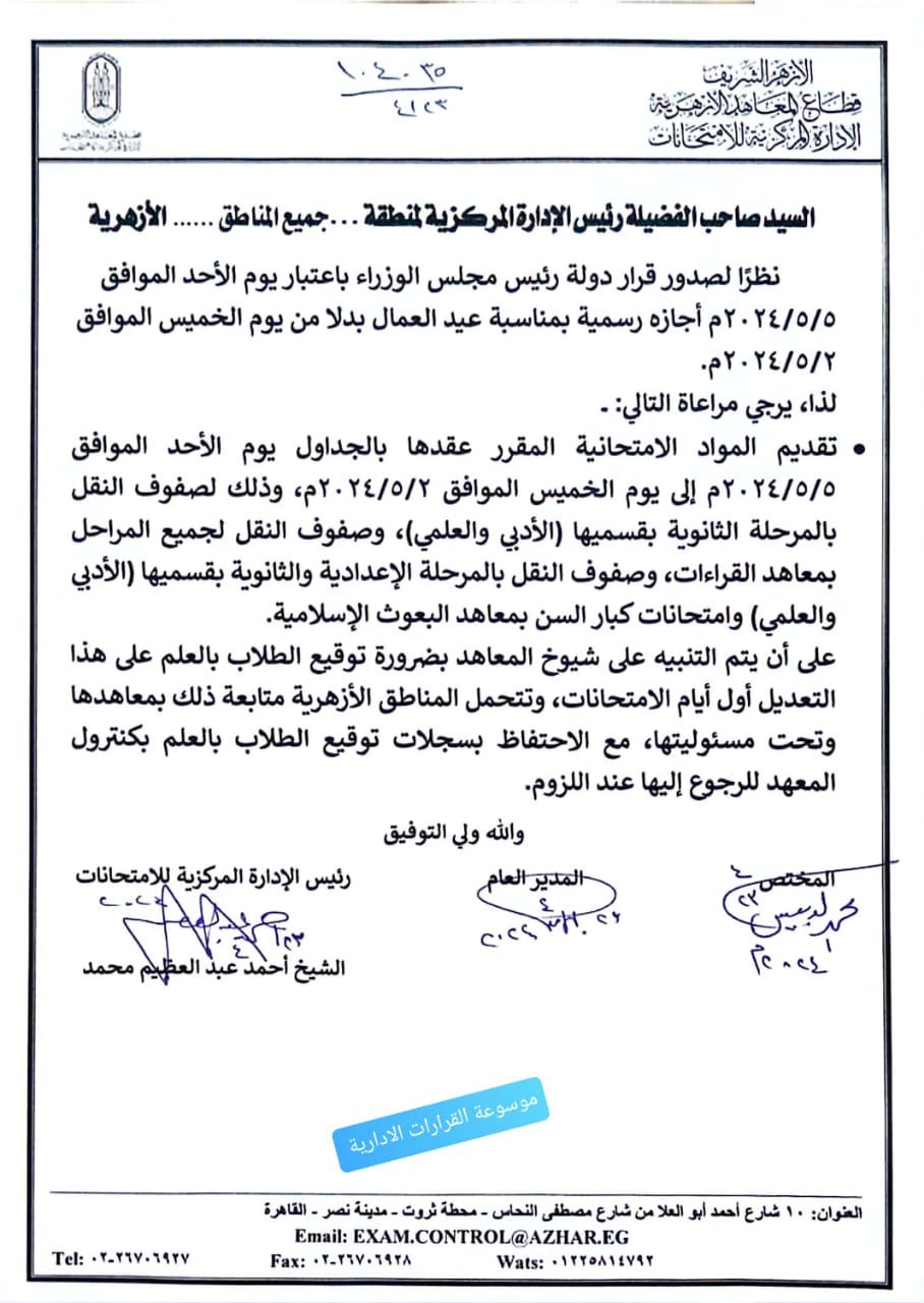 خاطب قطاع المعاهد الأزهرية، مديرى المناطق على مستوى الجمهورية، عقب صدور قرار رئيس مجلس الوزراء باعتبار يوم الأحد الموافق 2024/5/5 م إجازة رسمية بمناسبة عيد العمال بدلا من يوم الخميس الموافق 2024/5/2م، بمراعاة تقديم المواد الامتحانية المقرر عقدها بالجداول يوم الأحد الموافق 2024/5/5م إلى يوم الخميس الموافق 2024/5/2م