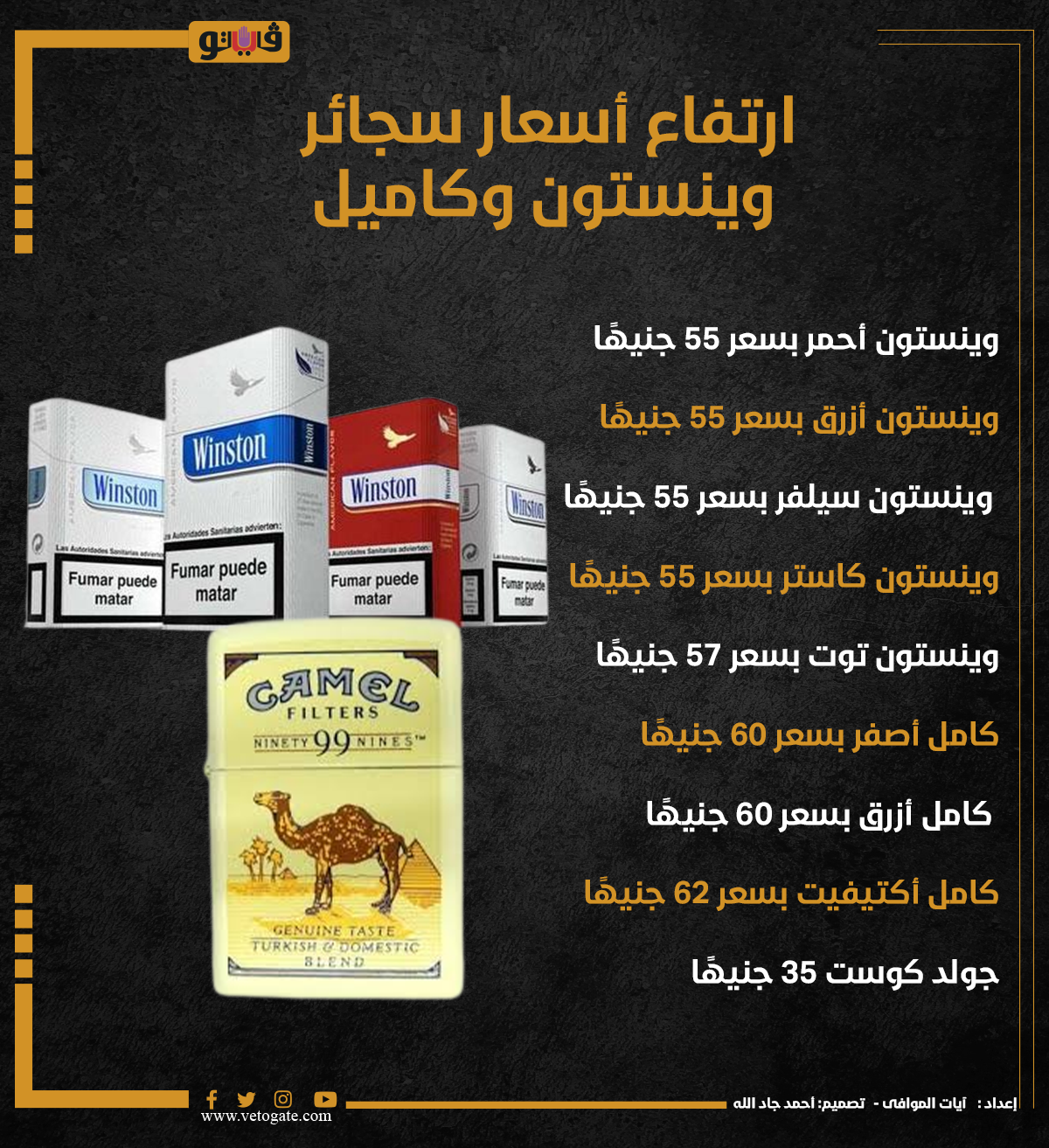 ارتفاع أسعار سجائر وينستون وكاميل (إنفوجراف) الأربعاء 24/أبريل/2024 - 10:14 م 4/24/2024 10:14:26 PM ارتفاع أسعار السجائر، فيتو آيات الموافى شارك طباعة 18 حجم الخط المصدر: شركة اليابان الدولية للتبغ JTI شارك طباعة وينستون السجائر إبراهيم الإمبابى رئيس شعبة السجائر والدخان بغرفة الصناعات الغذائية باتحاد الصناعات