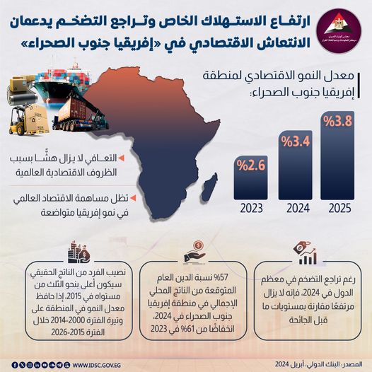 كشفت الصفحة الرسمية لمركز المعلومات ودعم اتخاذ القرار بمجلس الوزراء على موقع التواصل الاجتماعي "فيسبوك" عن معدل النمو الاقتصادي لمنطقة إفريقيا جنوب الصحراء.
