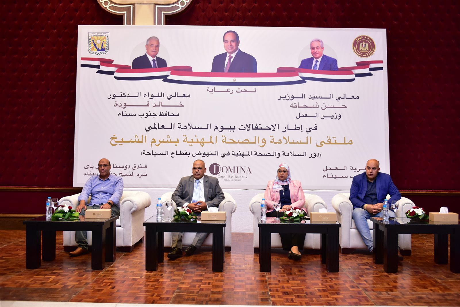 وتم افتتاح ملتقى السلامة والصحة المهني بكلمة محمد مأمون مدير فندق ومنتجع دومينا كورال باى شرم الشيخ بالترحيب بالسادة الحضور من مسؤولي السلامة والصحة المهنية بالمنشآت السياحية بجنوب سيناء، وكلمة أحمد مصطفى وكيل مديرية العمل بجنوب سيناء نيابة عن وفاء نجاح فهمى مديرة المديرية، بالترحيب بالحضور، وكلمة المهندسة غادة إبراهيم رئيس الإدارة المركزية للسلامة والصحة المهنية بوزارة العمل والتي لأشارت فيها الي جهود الوزارة بالتعاون مع إدارة ومكاتب السلامة بالمديريات في نشر الوعي بأهم مفاهيم السلامة والصحة المهنية ودور التوعية كخطوة استباقية لمنع الاصابات والحوادث في بيئة العمل.