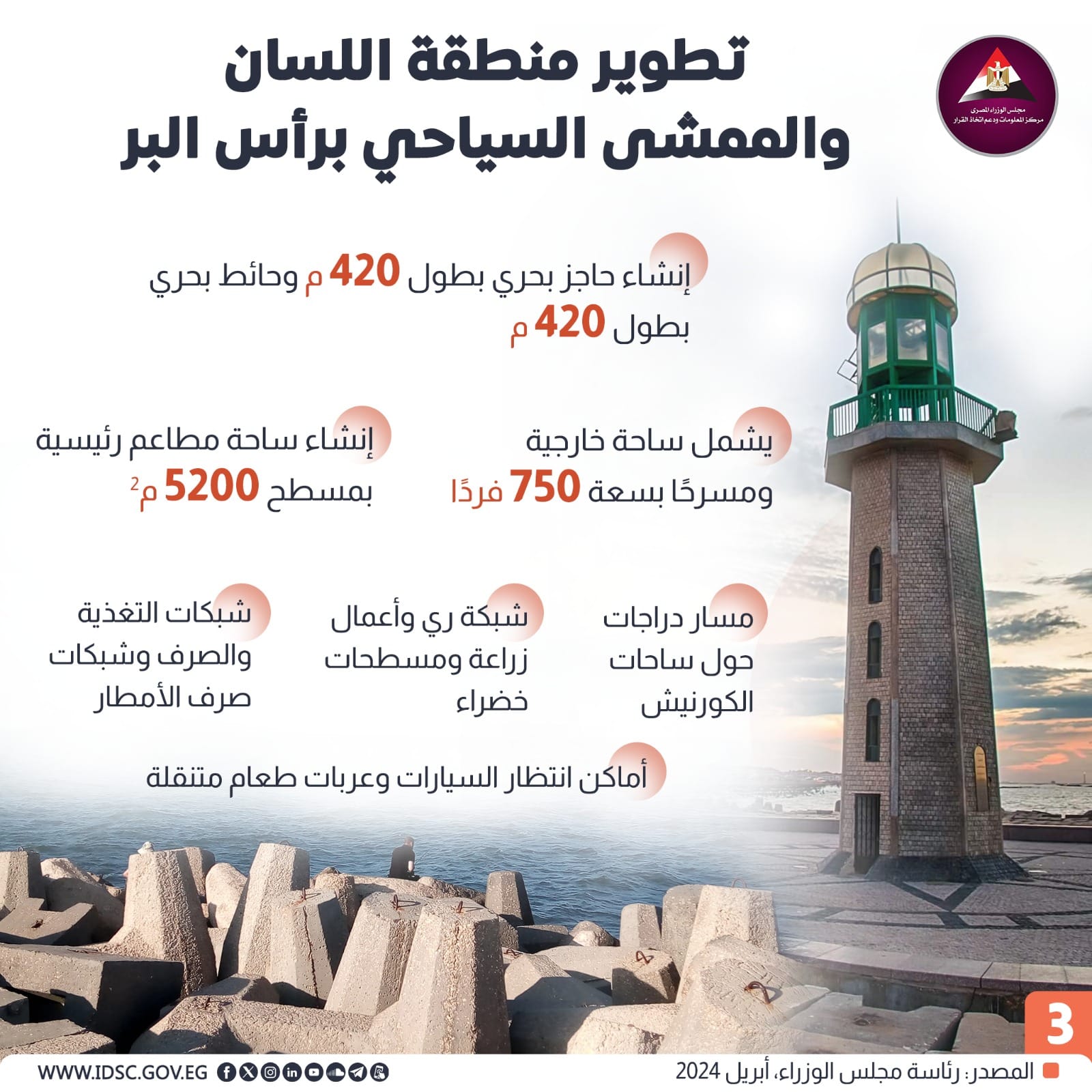 وقدّمت الدكتورة منال عوض محافظ دمياط، شرحًا لرئيس الوزراء حول مشروع تطوير منطقة اللسان والممشى السياحي بمدينة رأس البر، مُشيرة إلى أن المشروع يُحقق التطوير الشامل لهذه البقعة السياحية المهمة بمدينة رأس البر، موضحة أن أعمال التطوير تتضمن تدعيم حاجز الأمواج الغاطس الشمالي بمنطقة الخليج وإنشاء حاجز بحري بطول 420 مترًا طوليًا، وحائط بحري بطول 420 مترًا طوليًّا بطول الكورنيش، وذلك لحماية الشاطئ.